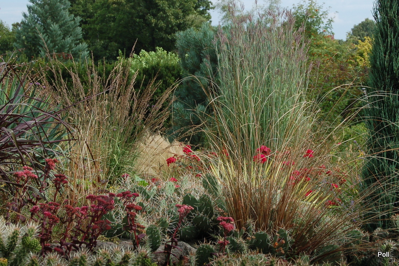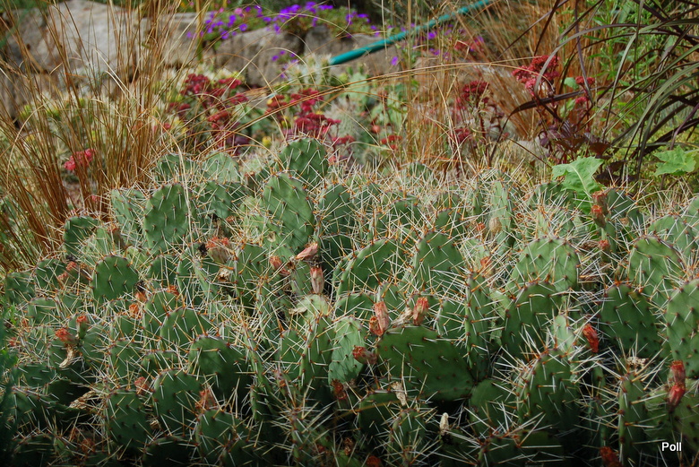 Pięknie skomponowane suche rabaty w Szkółce Grochowscy w Radkowie... Wśród roślin wielkie, zdrowo rozrośnięte kępy różnych opuncji , które nigdy - według słów właściciela - nie były przykrywane. Zdjęcia były robione 04.09.2016r, więc zamiast kwiatów, widzimy zawiązane owoce.