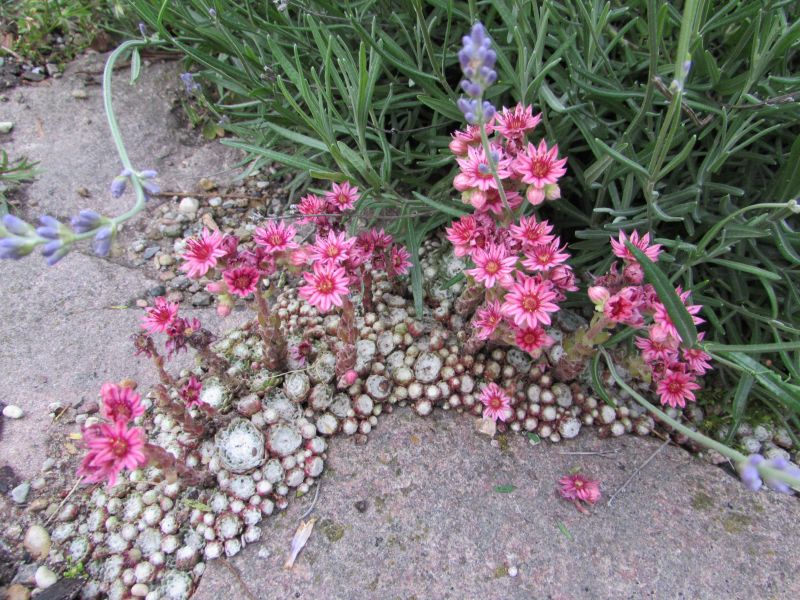 Jedyne miejsce w ziemi, gdzie rosną mi rojniki, to suche miejsce przy chodniku, w towarzystwie lawendy i rozchodnika ostrego. Tutaj rojniki posadziły mi się same, gdy w 2011 roku mocno namnożone rozetki "wyszły" z pojemnika w którym rosły.