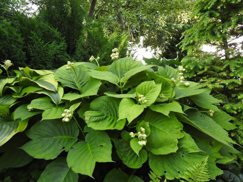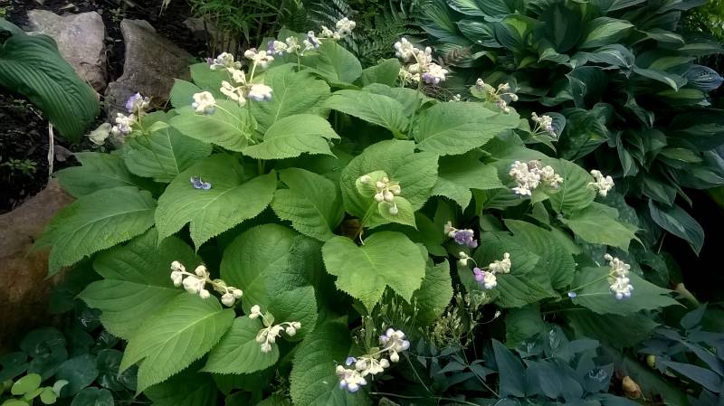 Bylina wysokości 40-50 cm o niezwykle ciekawym wyglądzie. Kwitnie w czerwcu/lipcu niewielkimi fioletowo-niebieskimi kwiatami. Niewymagająca, całkowicie mrozoodporna. U mnie rośnie w cieniu, ale w godzinach dopołudniowych ma nieco słońca. Posadziłam w ziemię kompostową trzy lata temu i od tej pory nie nawożę. Towarzyszą jej rododendrony więc może mieć nieco kwaśne podłoże.