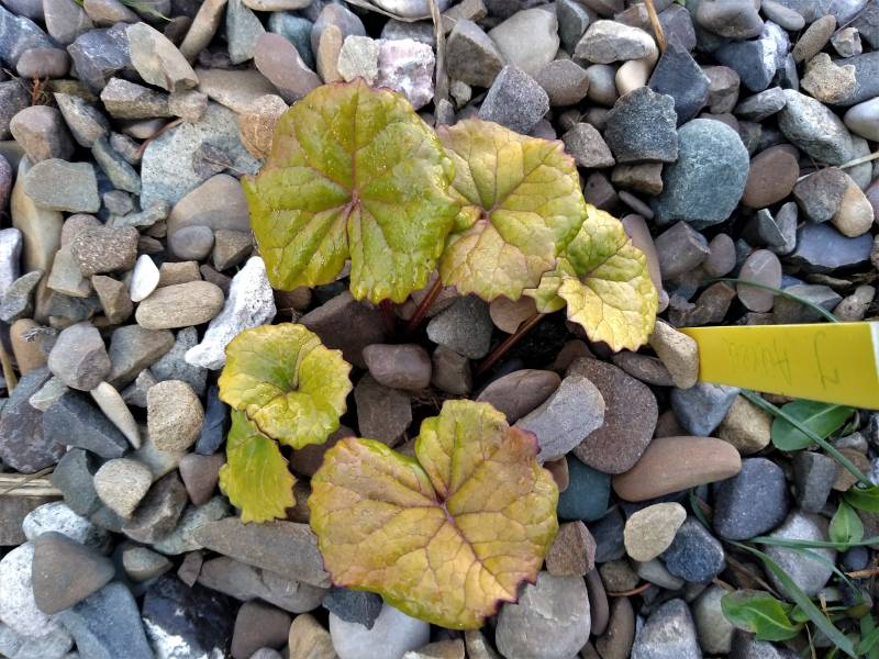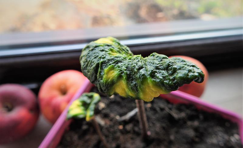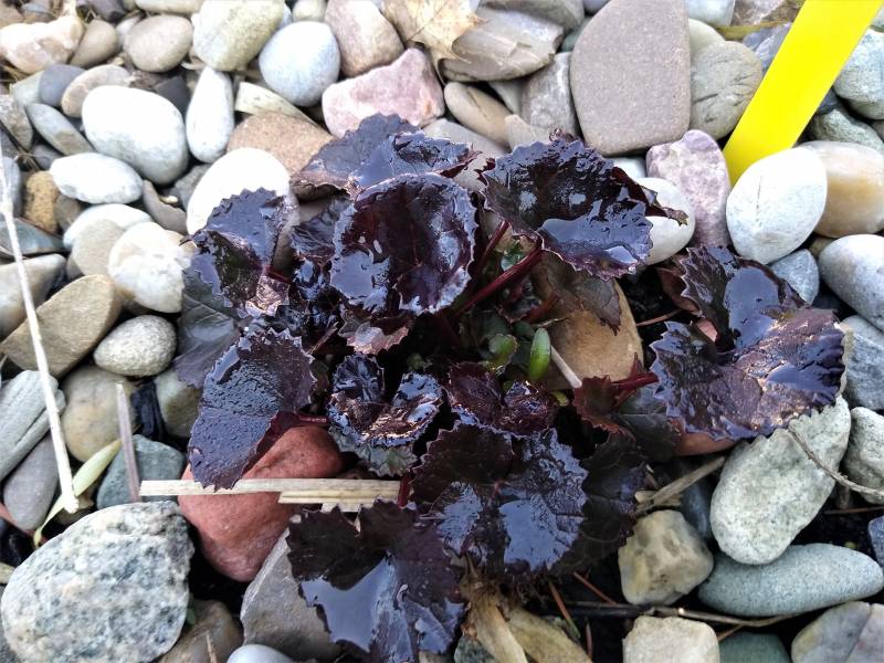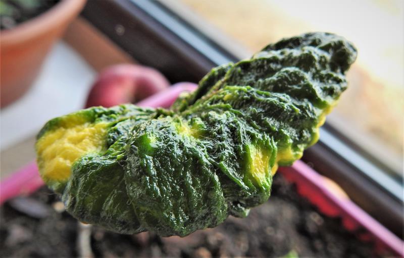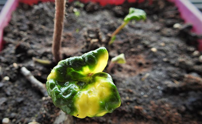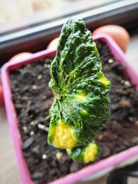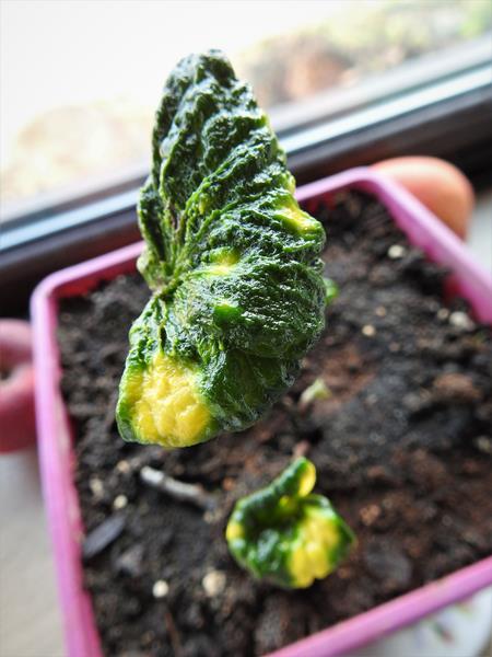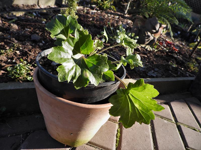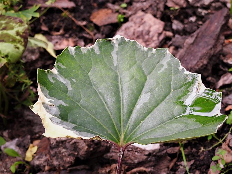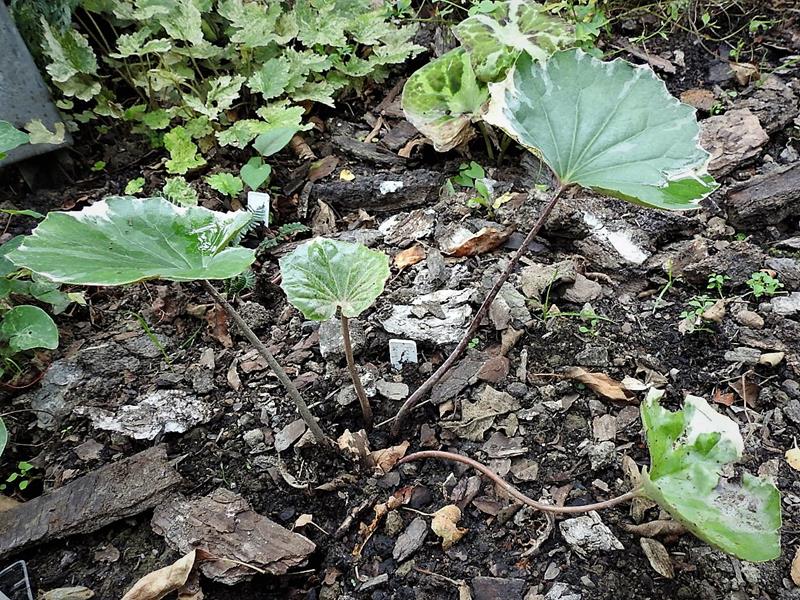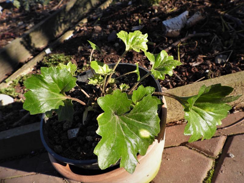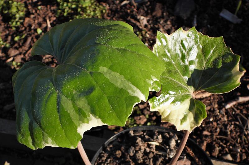 Ligularia tussilaginea 'Ukigumo Nishiki' ma tylko dwa listki, bo w pomieszczeniu chwyciła chorobę grzybową i mszyce :(