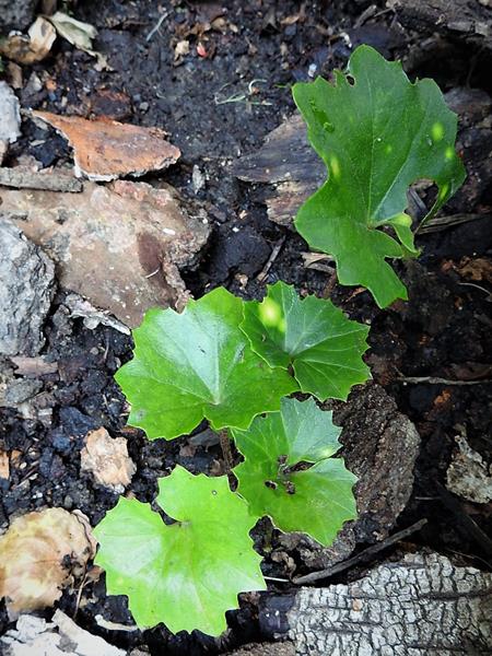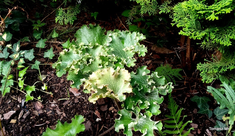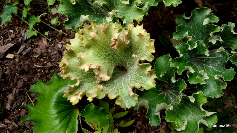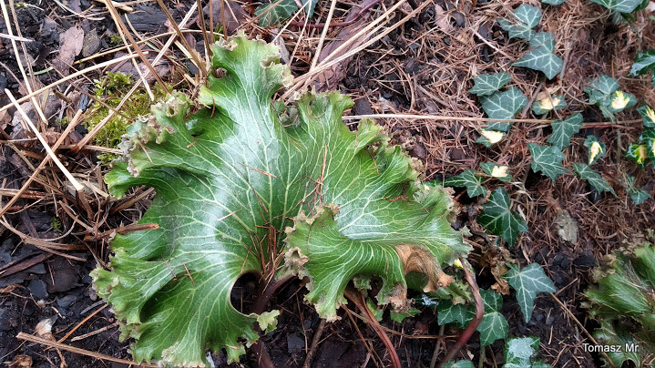 Farfugium japonicum 'Hotaru Fu'syn. Ligularia tussilaginea zimowy zakup. Osobiście jestem zachwycona tą rośliną. Liście są mocno błyszczące, pomarszczone, w ciapki, jak u salamandry. Dotykając liść ma się wrażenie jakby był ulany z wosku.