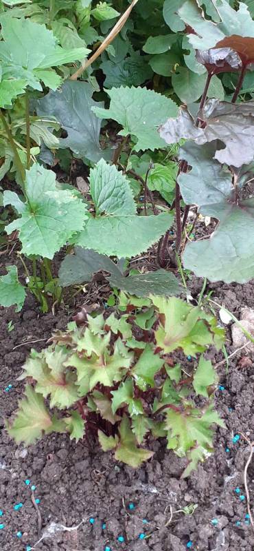 Ligularia tussilaginea 'Gojisi', dobrze przezimowała pod kopcem ze ściółki. Kilka problematycznych roślin zabezpieczyłem na zimę w ten sposób z dobrym skutkiem.')