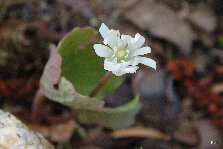 Młode siewki Sanguinaria canadensis wyrosłe pod starszymi roślinami. Mają one sercowate, ale charakterystycznie kanciaste listki.