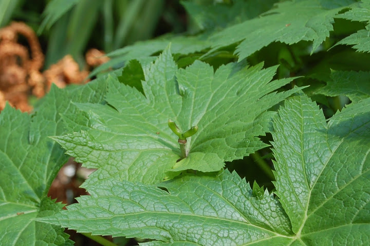 Liście glaucidium są jasnozielone i chropowate. W kształcie dłoniaste, z pięcioma 'wydzielonymi palcami' , klapowane i wyraźnie ząbkowane a - szczególnie na spodzie - widzimy ich unerwienie.