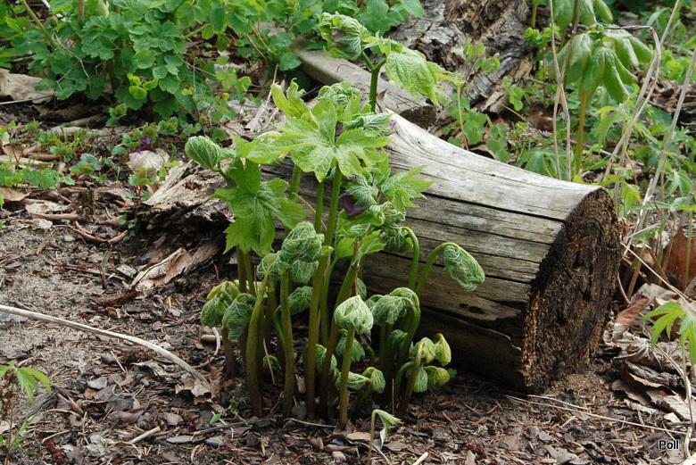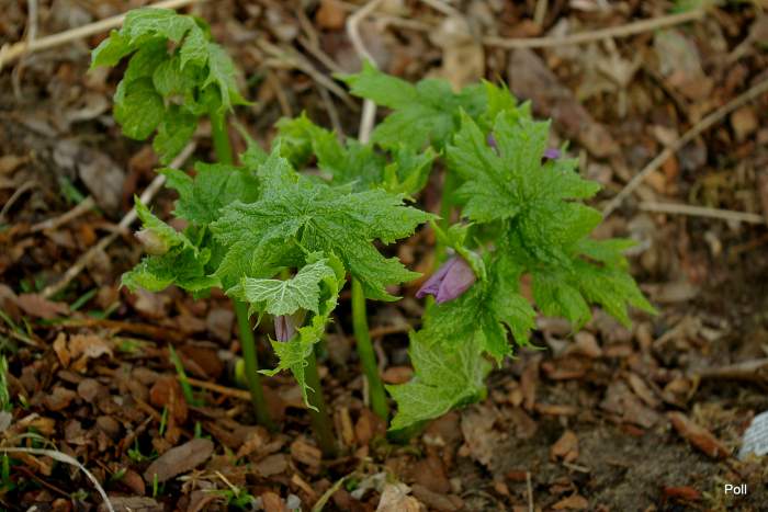 Glaucidium palmatum pojawia się na powierzchni ziemi, błyskawicznie, w ciągu dosłownie kilku dni rozwija liście i ukazuje ukryte w nich kwiaty.
