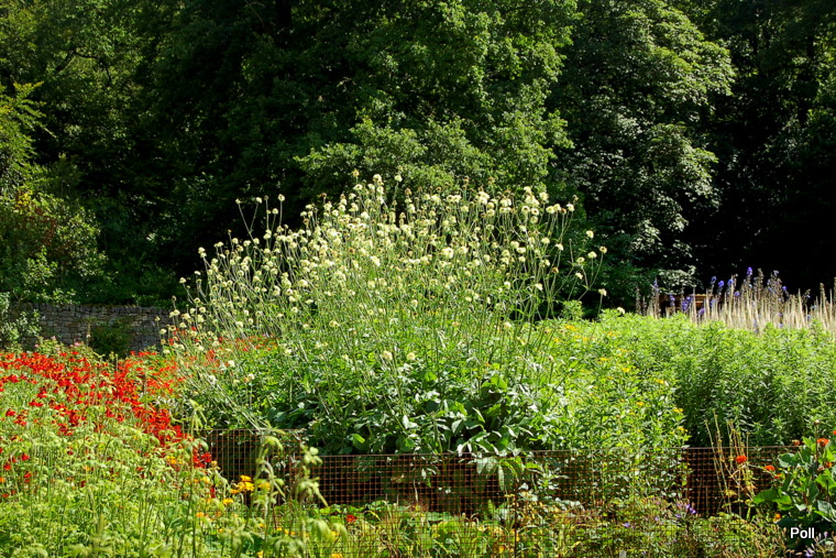 Olbrzymie, rozrośnięte kepy głowaczka olbrzymiego w ogrodzie kuchennym w Chatsworth (Derbyshire, UK)