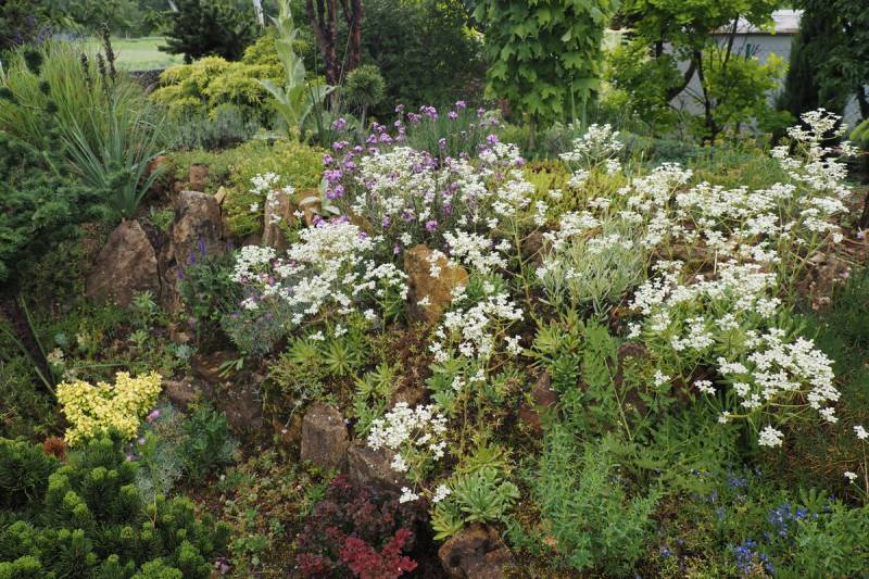 Na słonecznej części górki skalnej rozpoczęła kwitnienie Saxifraga 'Polar Drift'
