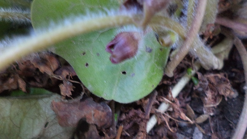 Jesienią przeniosłam Asarum maximum na nowe, bardziej widne i przestronne stanowisko. Właśnie zamierza kwitnąć flower