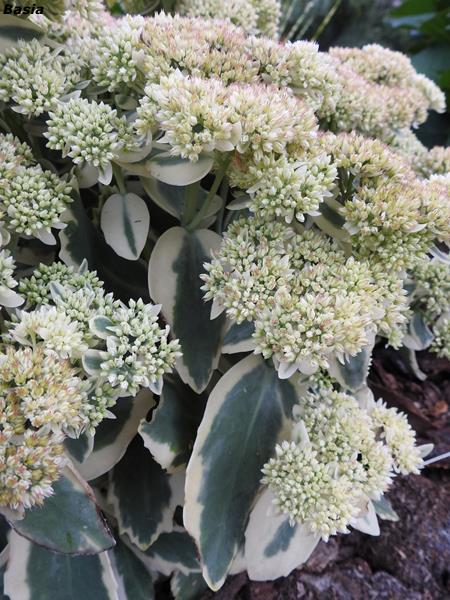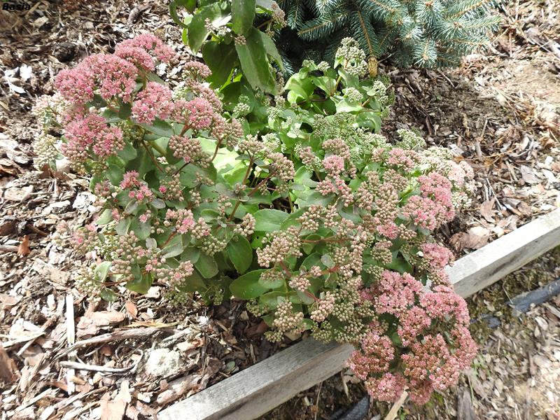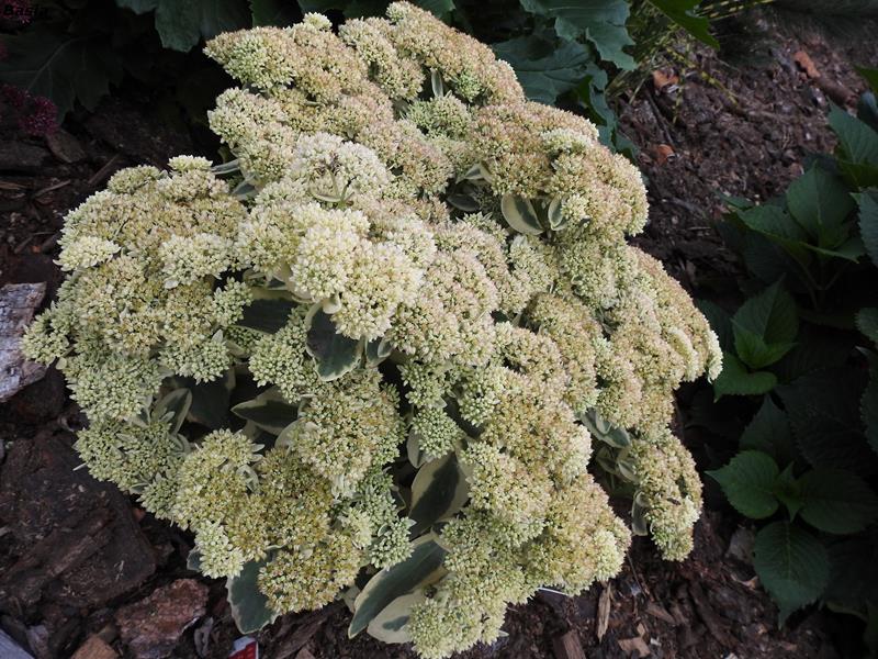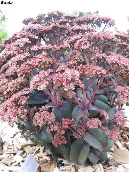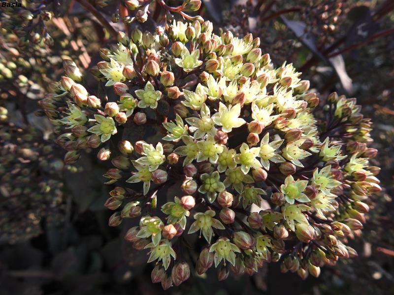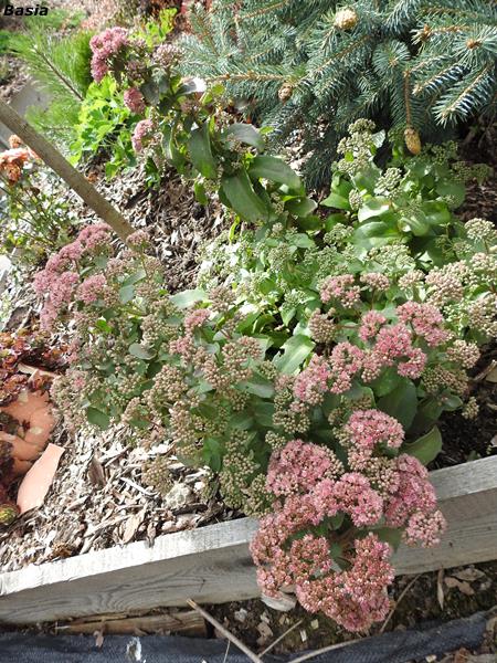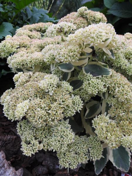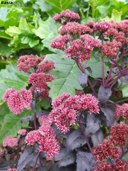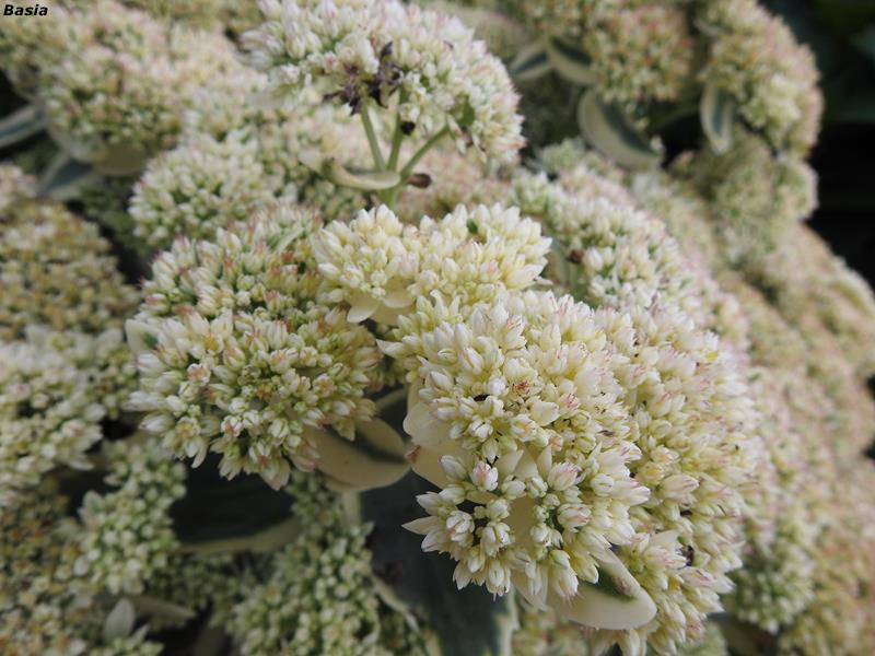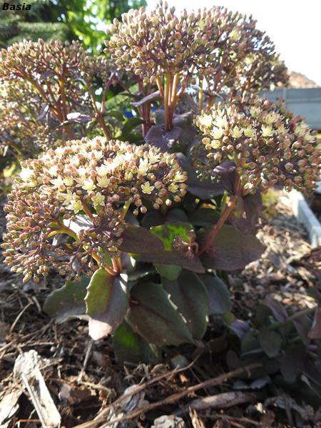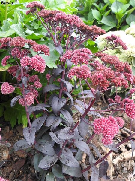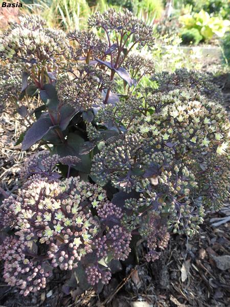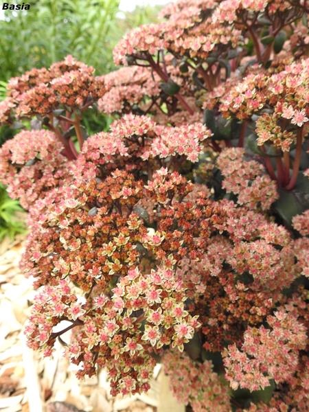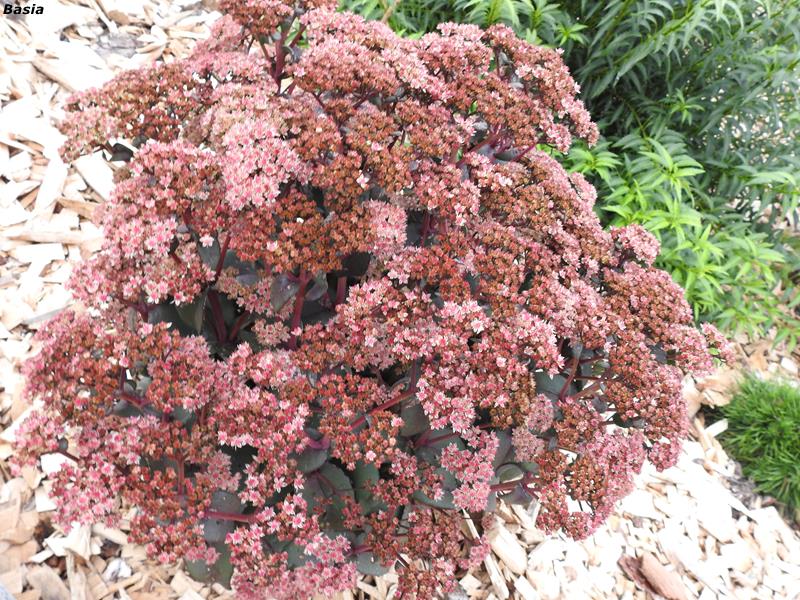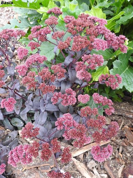 Kwiaty pojawiają się od sierpnia i kwitną do mrozów. Z początku zielone, w miarę rozkwitania przebarwiają się do ciemno-różowych. W bardzo gęstych, spłaszczonych niby baldachach, pokrywają całą roślinę jak parasol.
