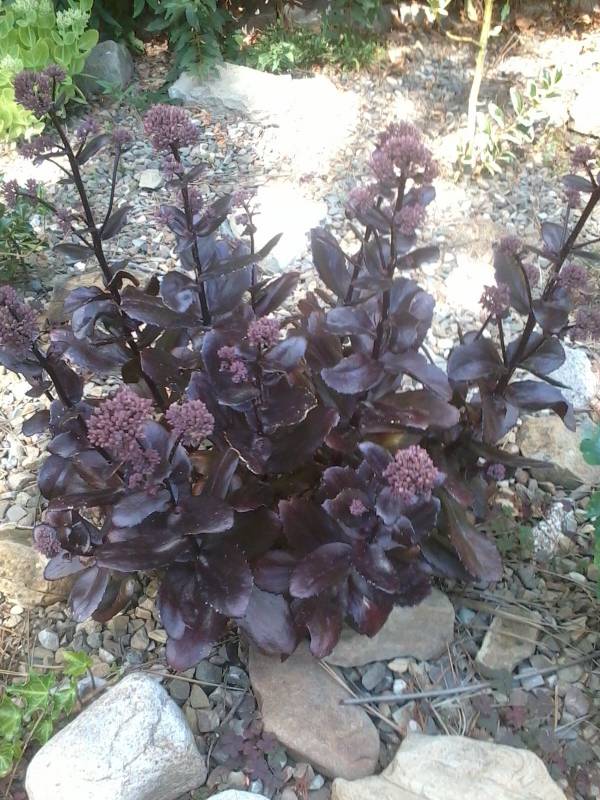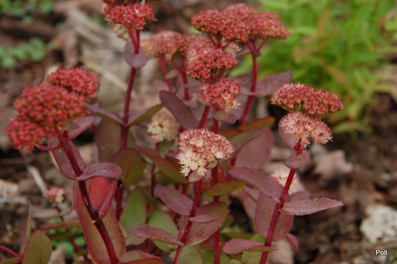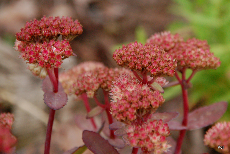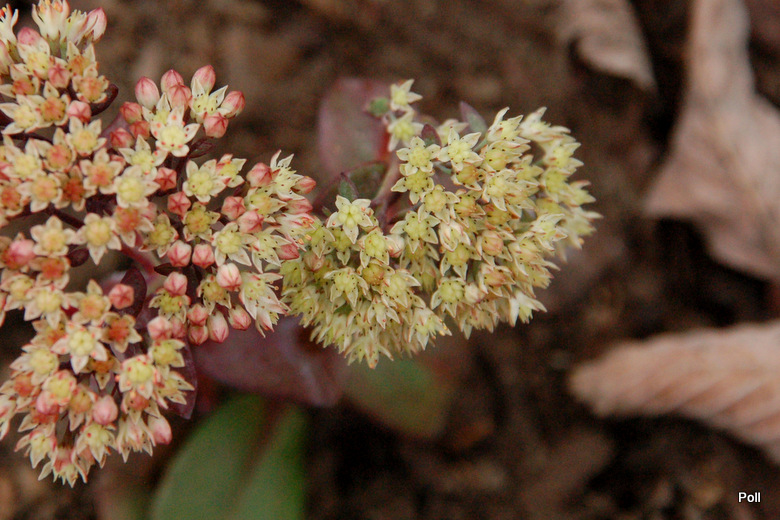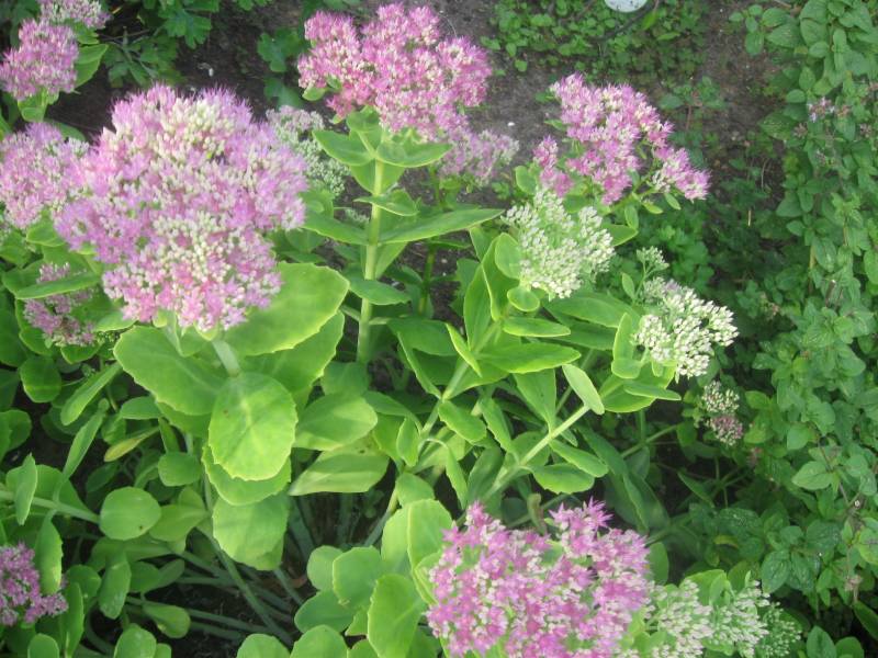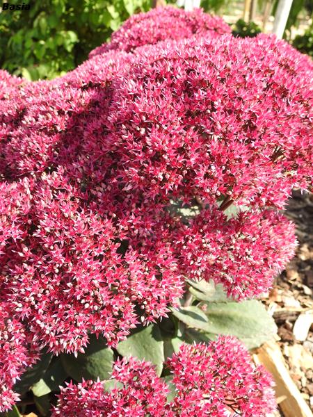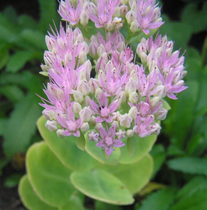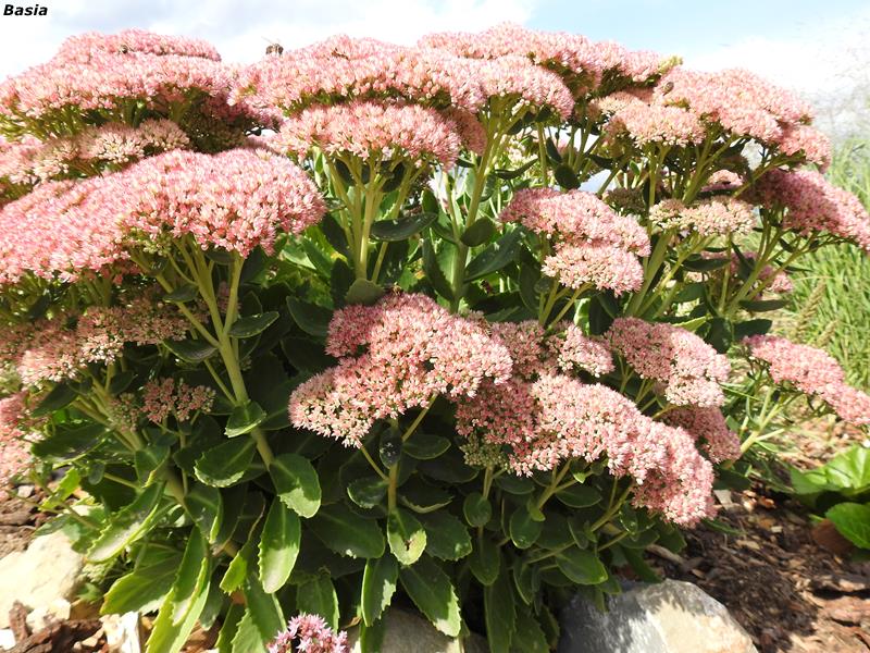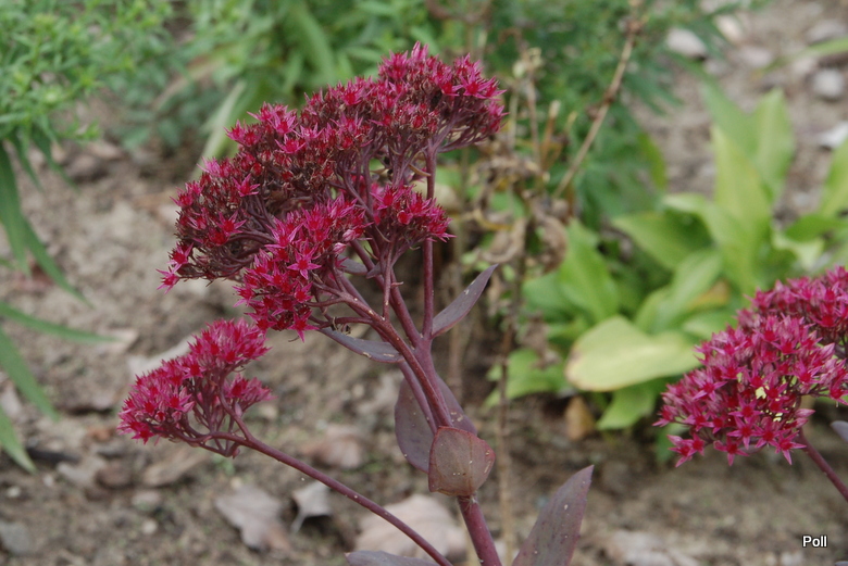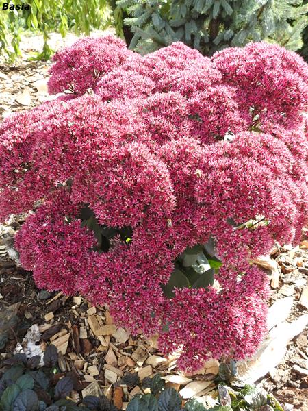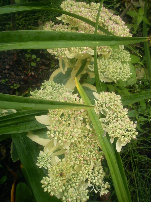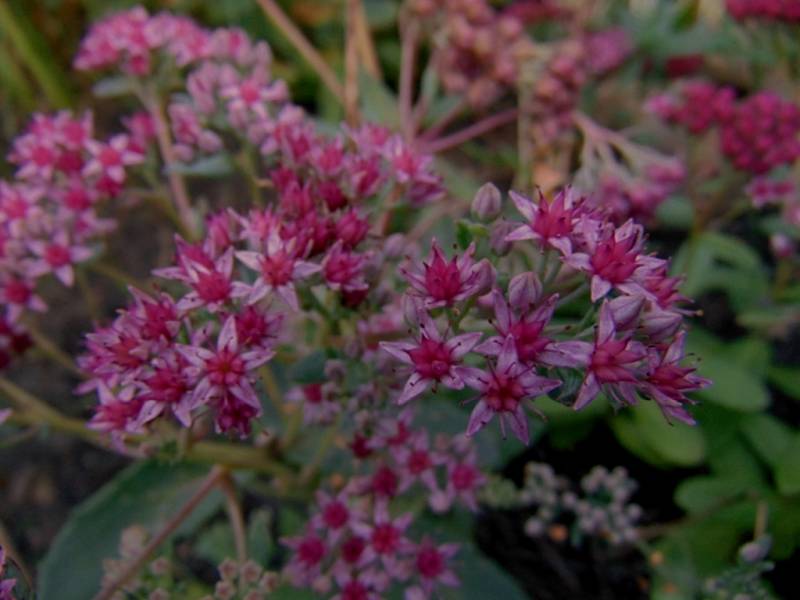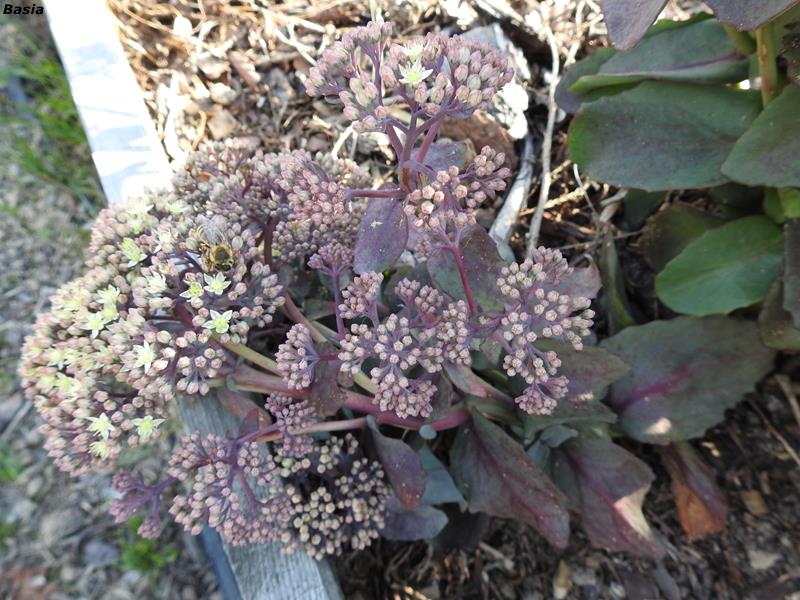 Kwiaty pojawiają się od sierpnia i kwitną do mrozów. Z początku zielone, w miarę rozkwitania przebarwiają się do ciemno-różowych. W bardzo gęstych, spłaszczonych niby baldachach, pokrywają całą roślinę jak parasol.