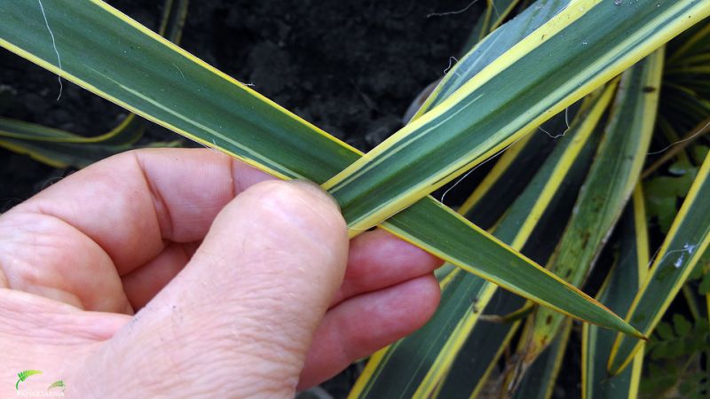 Liście zimozielone, sztywne i skórzaste, długości do 60 cm i szerokości 3-5 cm, wyrastając z łodygi tworzą rozetę. Kolor liści mocno i szeroko żółto obrzeżone środki błękitno-zielone.