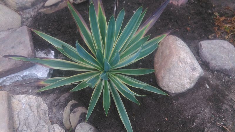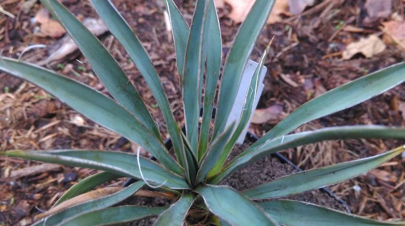 Liście sino zielone, rozszerzające się środkiem, sztywne, zakończone ostrym kolcem, do 20 cm