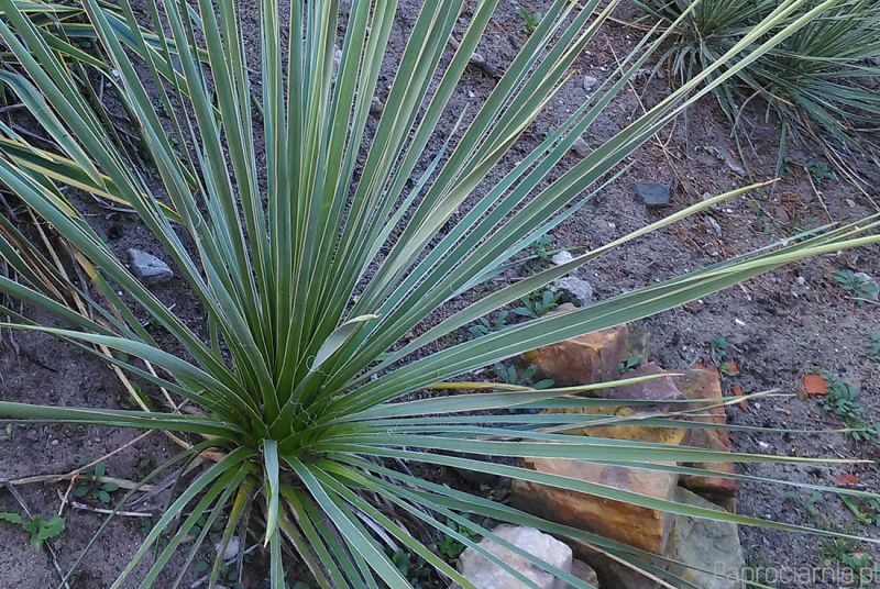Kwiaty nisko osadzone jak u juki sinej tylko kwiatostan znacznie mniejszy i bardzo zwarty, do 50 cm