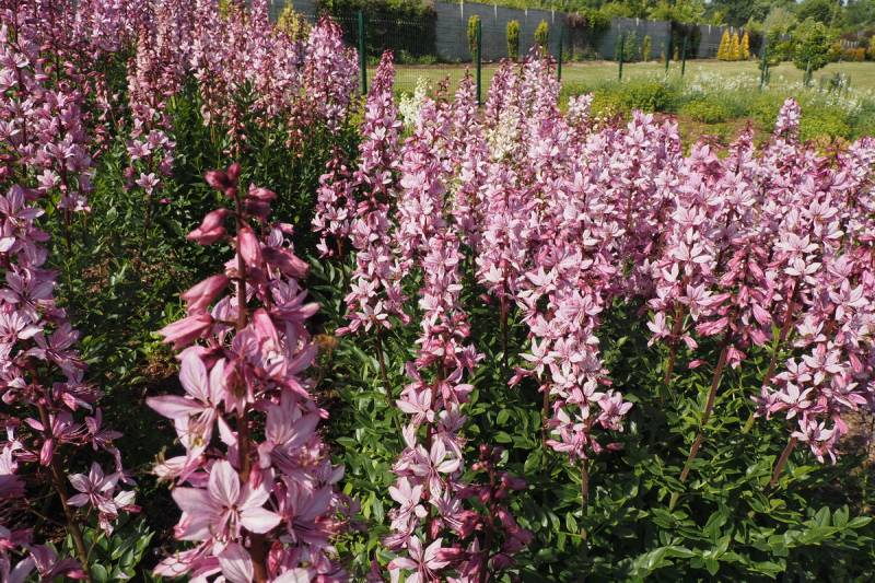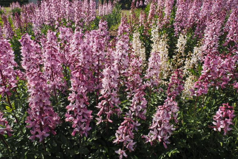 Kwiaty różowe i białe, z ciemniejszymi żyłkami, zebrane w grona na szczytach łodyg.
