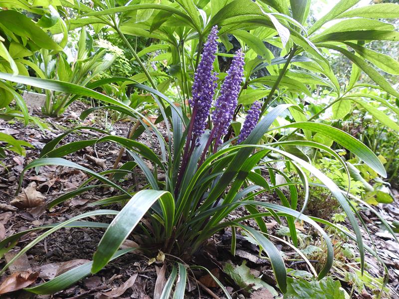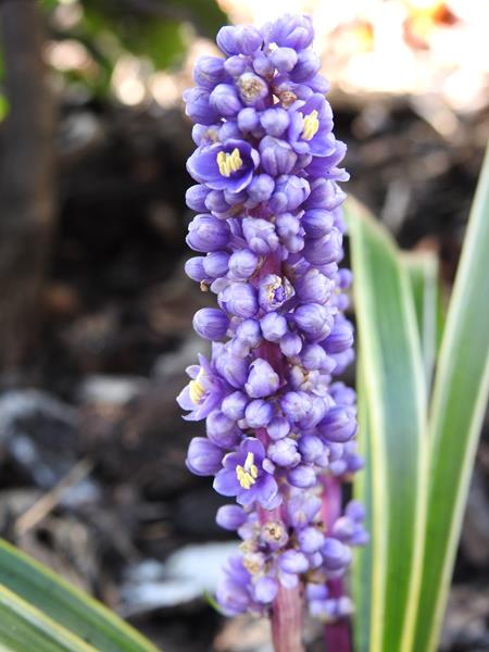 Zakwitło Liriope muskari Variegata.Miejsce z popołudniowym słońcem