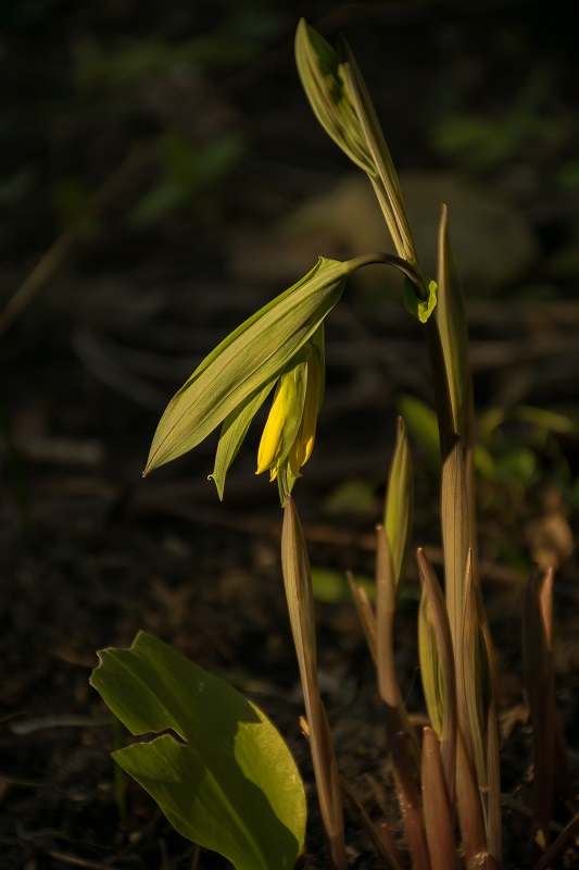 Uvularia perfoliata, czyli jagodowiec przerosłolistny. Ledwo wydobył się z ziemi i już kwitnie