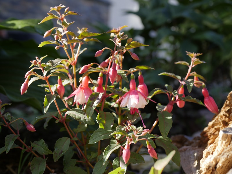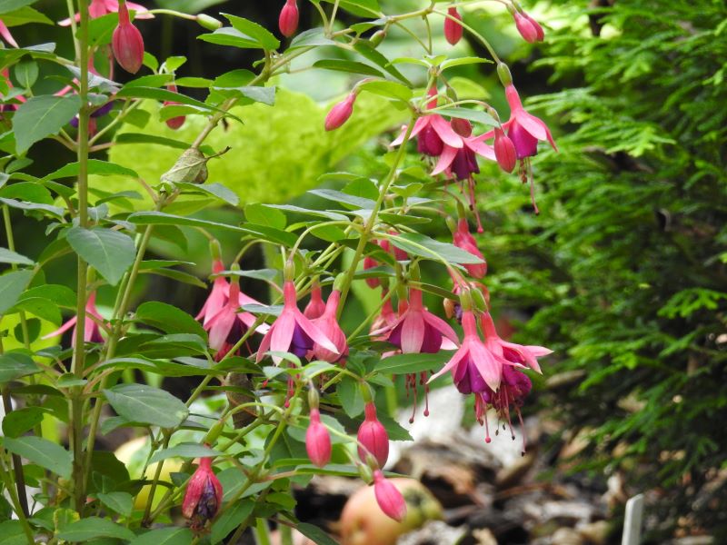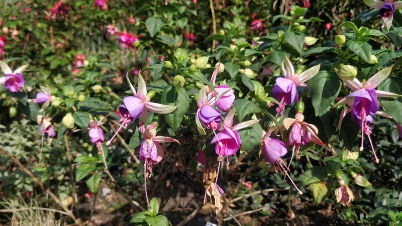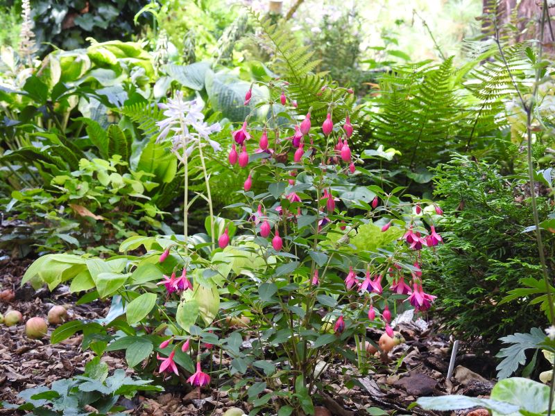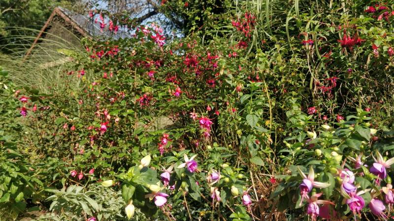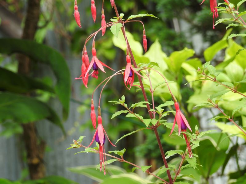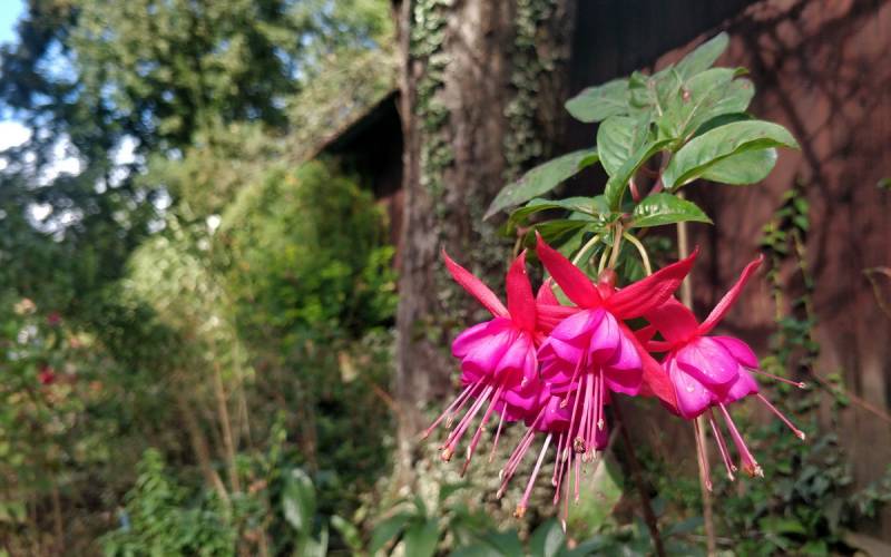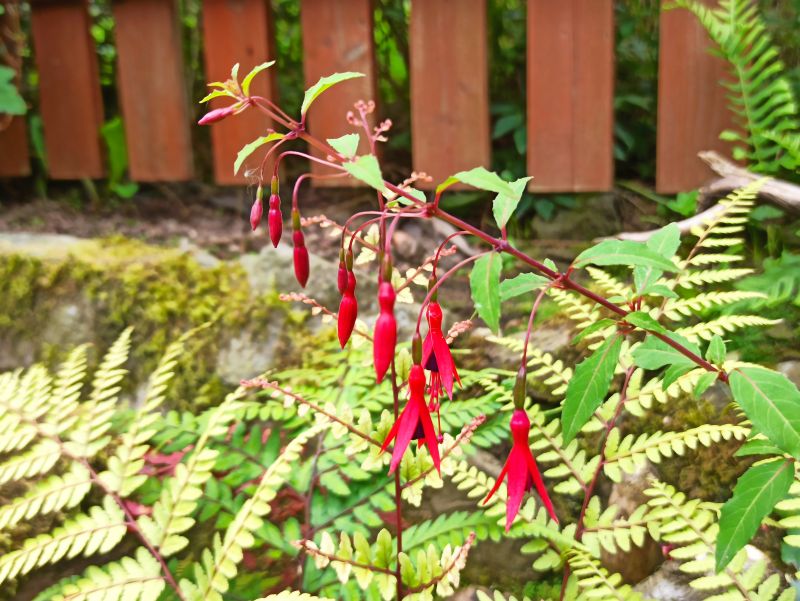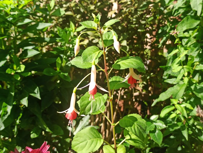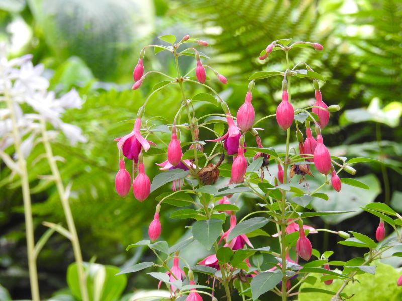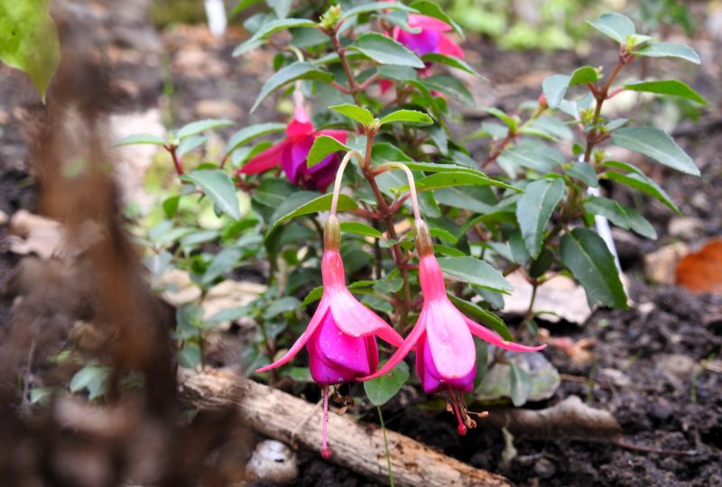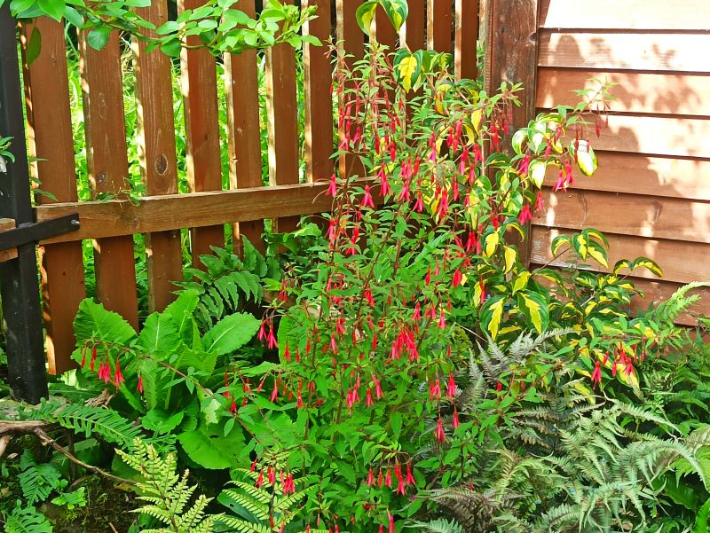 Fuksja magelańska rośnie w strasznym ścisku, ale kwitnie niezawodnie.
