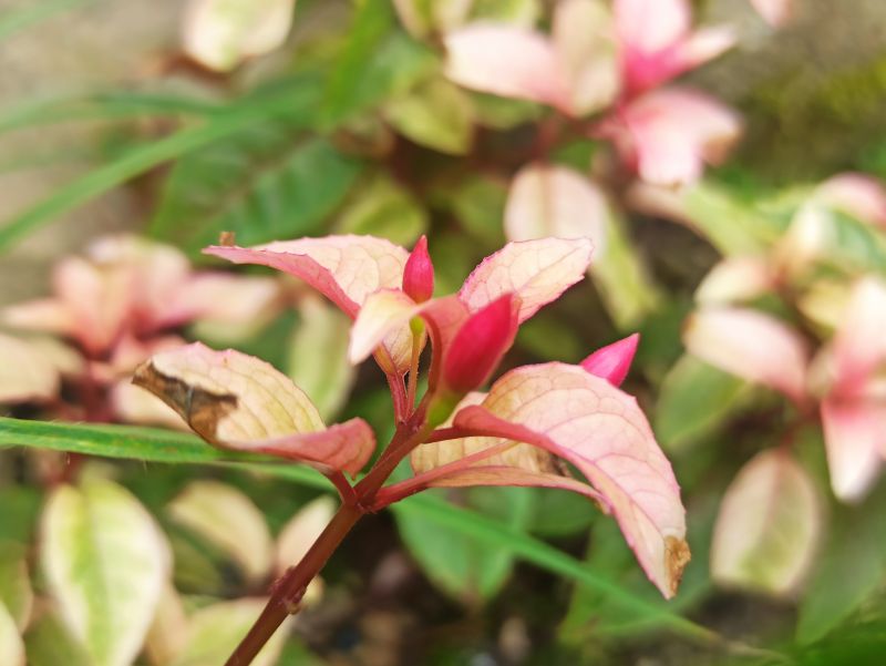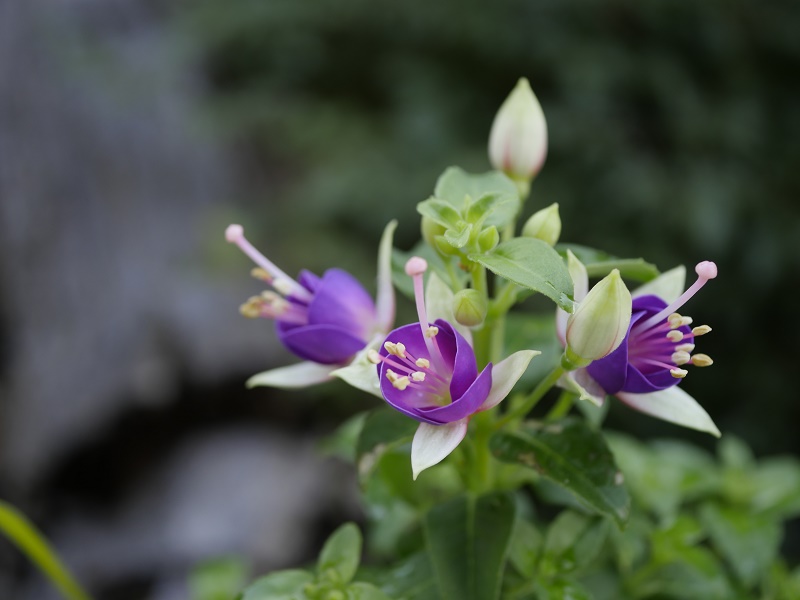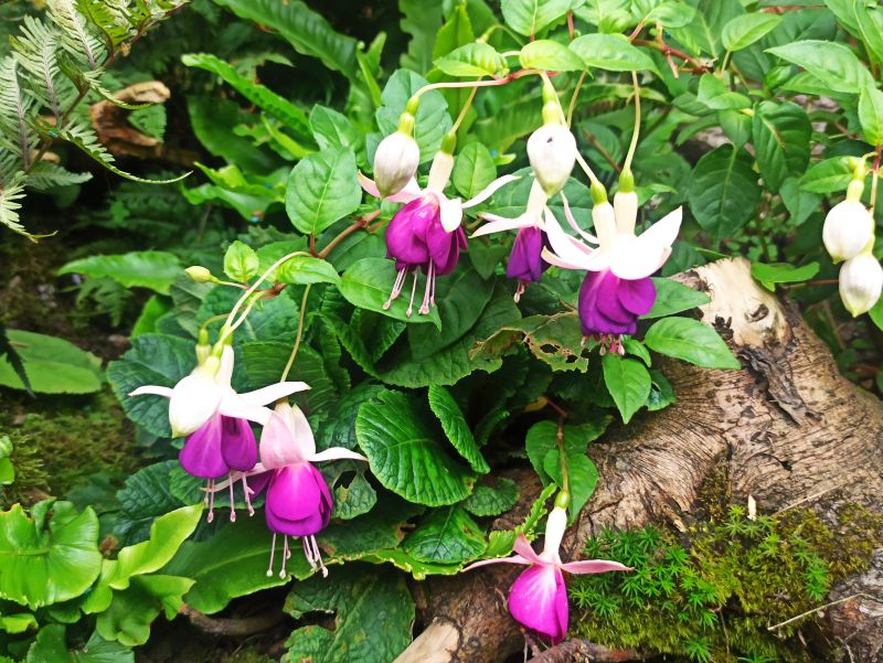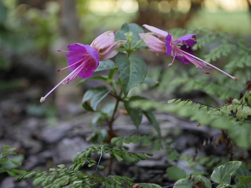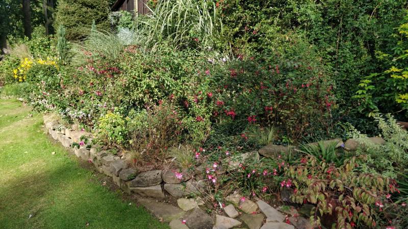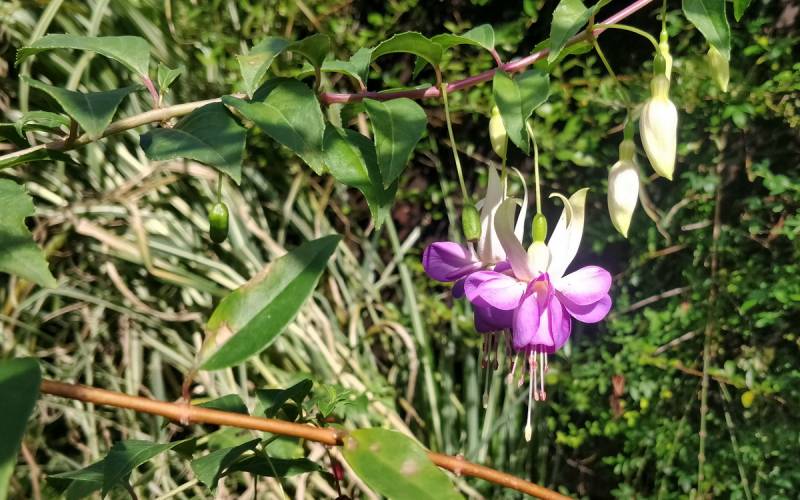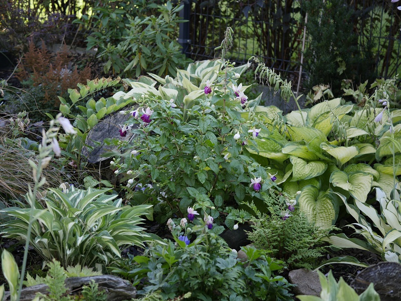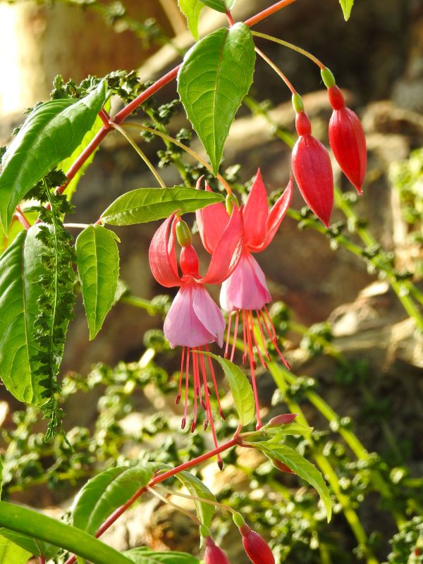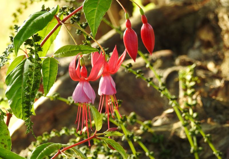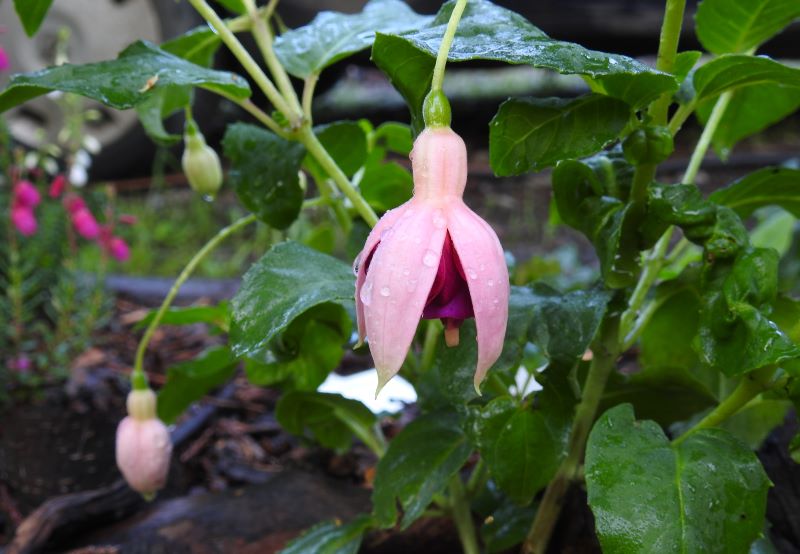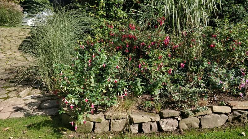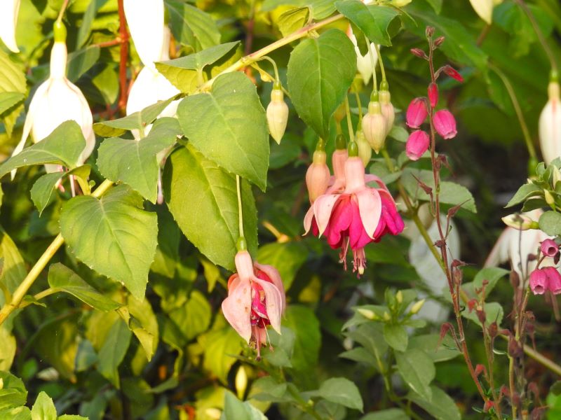 Fuksja magelańska rośnie w strasznym ścisku, ale kwitnie niezawodnie.