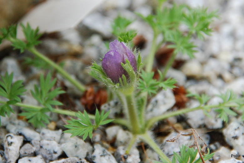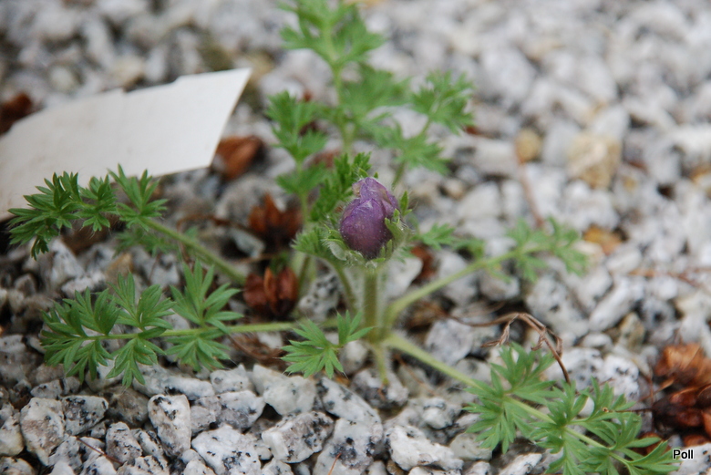 Młodziutka sadzonka Pulsatilla albana ładnie przetrwała zimę i zbiera się do kwitnienia