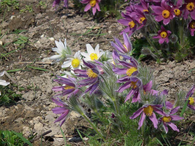 Wymyśliłem sobie też pole sasankowe z mojej starej czerwonej sasanki, podzieliłem ją i dosadziłem dużo jej siewek i wyszła pstrokacizna bo prawie każda ma inny odcień :lol: