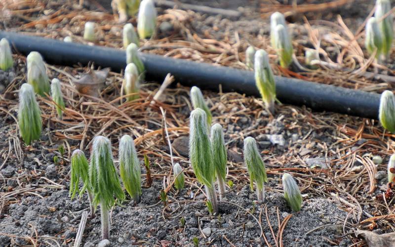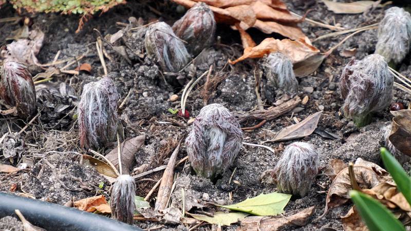 Stanowisko tej kępki Syneilesis palmata (siewka?) 'Houou' jest obecnie dość słoneczne, więc widzę szybko rozwijające się parasolki, natomiast druga kępka, większym cieniu, dopiero wystawia owłosione łebki: