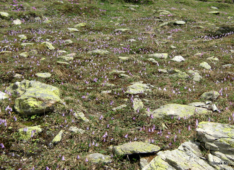Soldanella montana – bardzo rzadko występujący w Karpatach