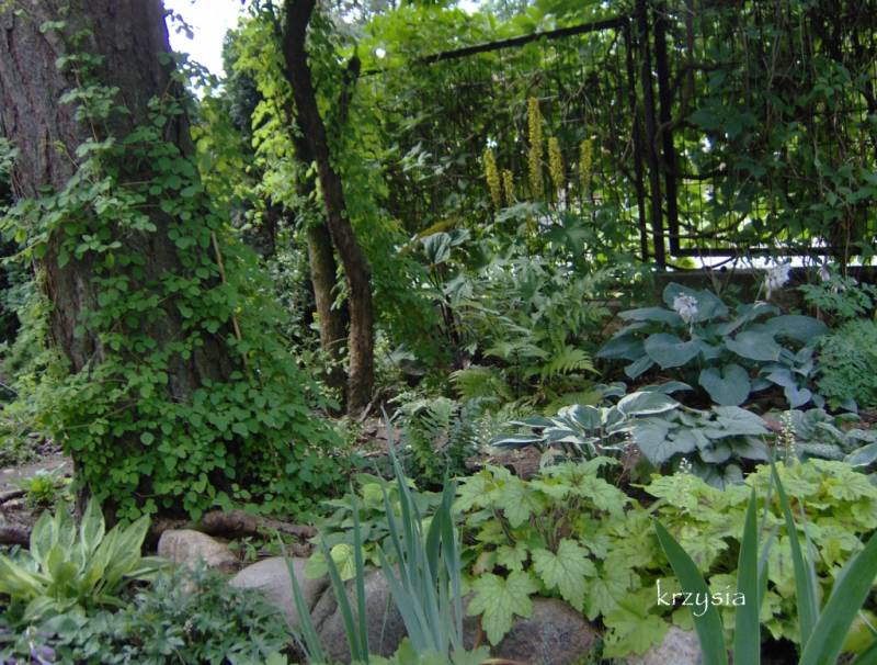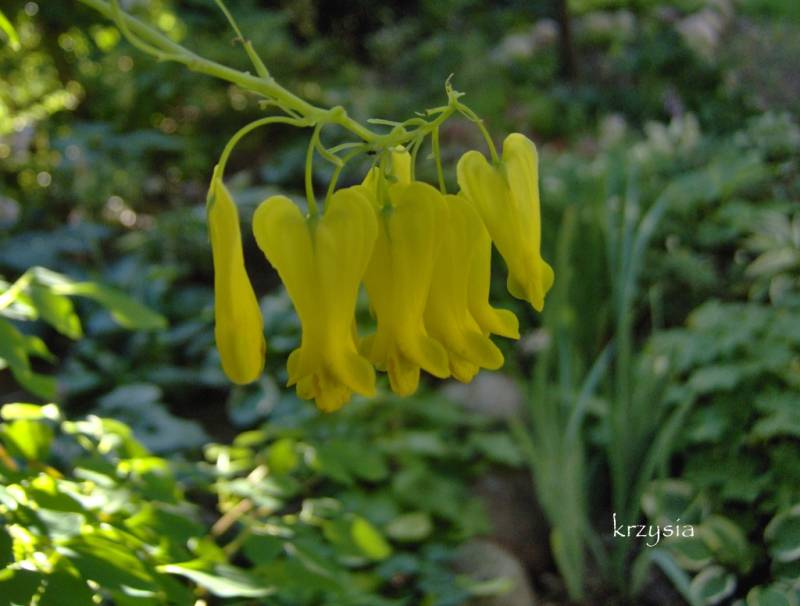 (Dicentra lichiangensis) - pochodząca z Nepalu i Dicentra macropoda z Himalajów, nie pamiętam którą posadziłam pod sosną, a którą pod bzem krecigl . Pierwsza powinna mieć czerwone ogonki, ale w tej chwili obie wyglądają jednakowo.