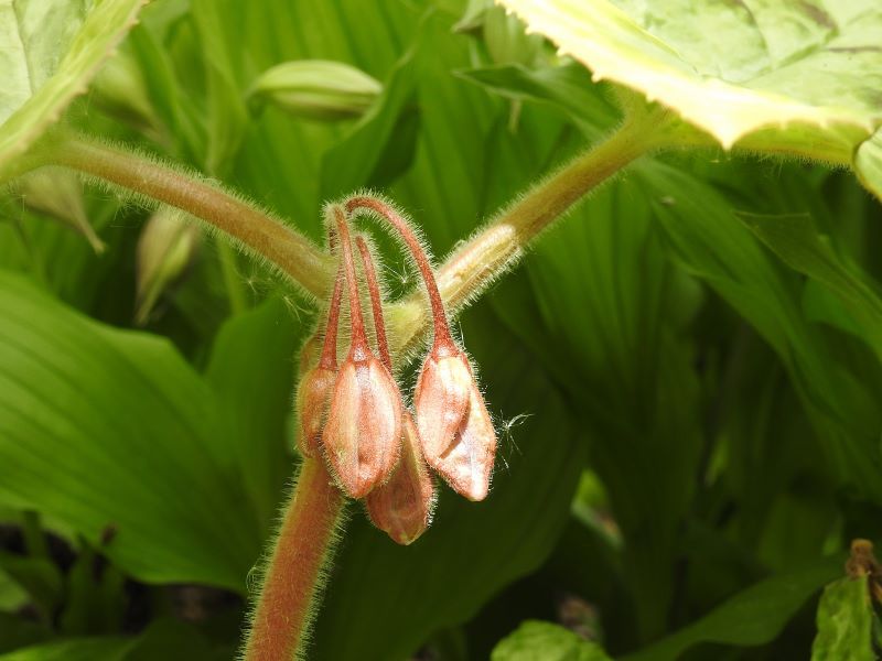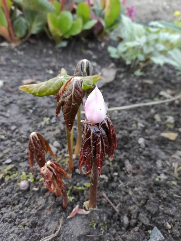 Podophyllum Spotty Dotty pokazał pąki kwiatowe.