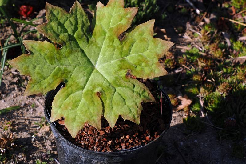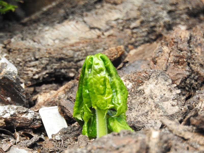 Podophyllum hemsleyi bardzo szybko startuje wiosną i co rok, pierwsze parasolki przemarzają. Dostał więc bardziej cieniste stanowisko niedaleko sosny.