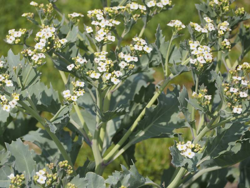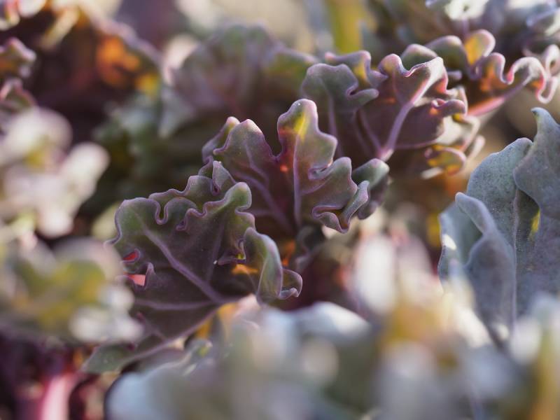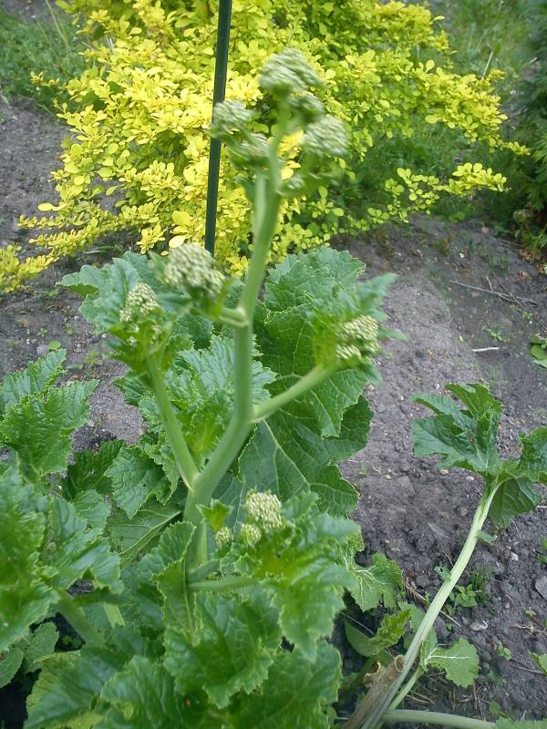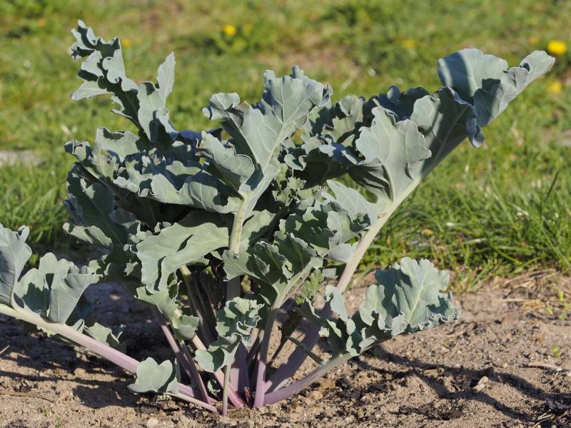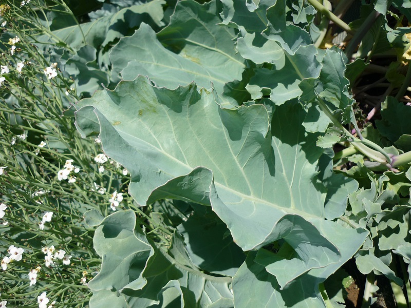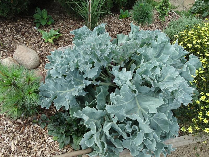Liście duże, podłużne, pofalowane, poczatkowo purpurowo nabiegłe, potem niebiesko-zielone, wyglądem przypominają liście kapusty.