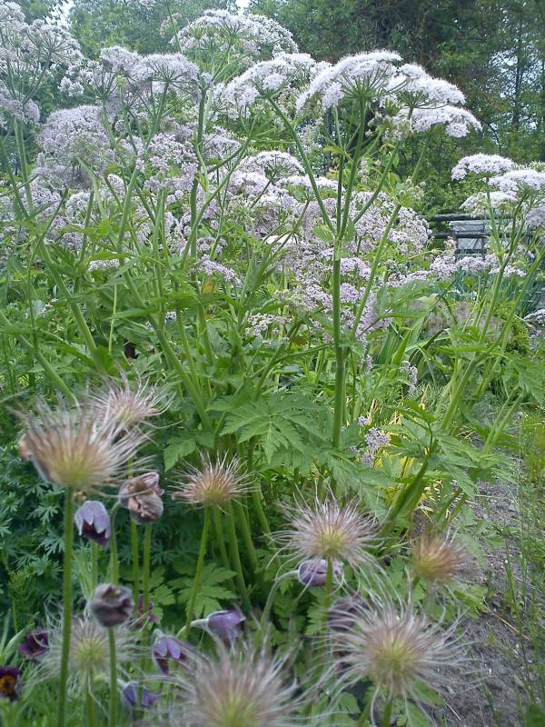 Kwitnie bardzo długo, teoretycznie zaczyna w czerwcu, ale w pierwszym roku uprawy mój zaczął już 1.05. Kwiaty drobniutkie, białe, zebrane w wielkich baldachach. Co ciekawe, u większości roślin pędy kwiatowe wyrastają wysoko, zakwitają na szczytach a potem pochylają się pod ciężarem kwiatów; tu jest inaczej: kwiaty rozwijają się w czasie wzrostu pędów i powoli dźwigają się wzwyż - robi to duże wrażenie za pierwszym razem.