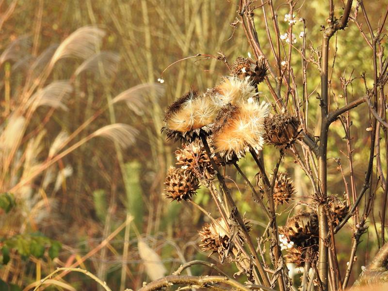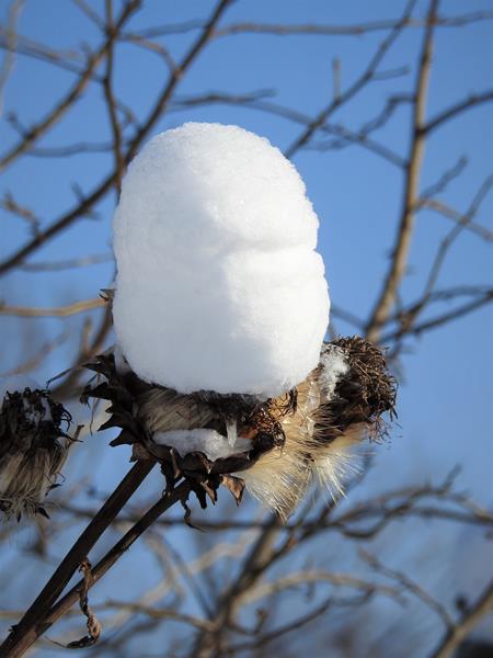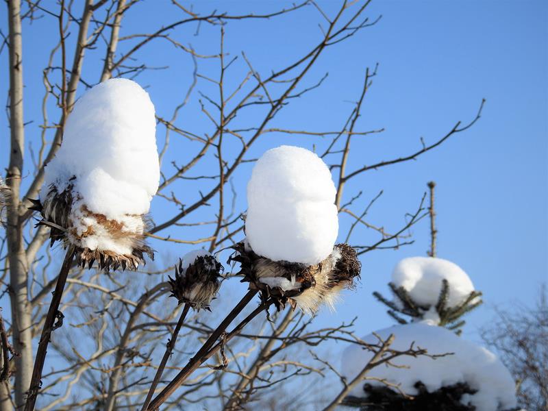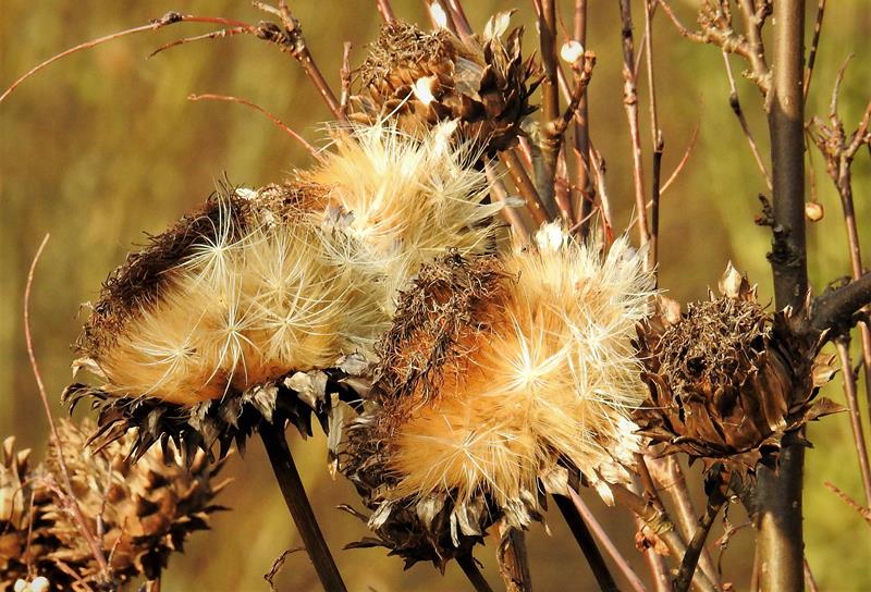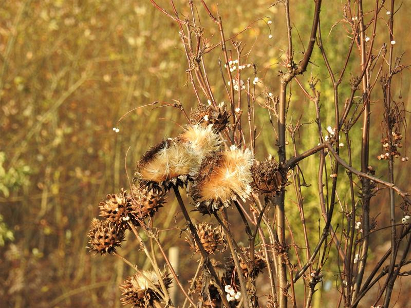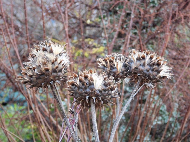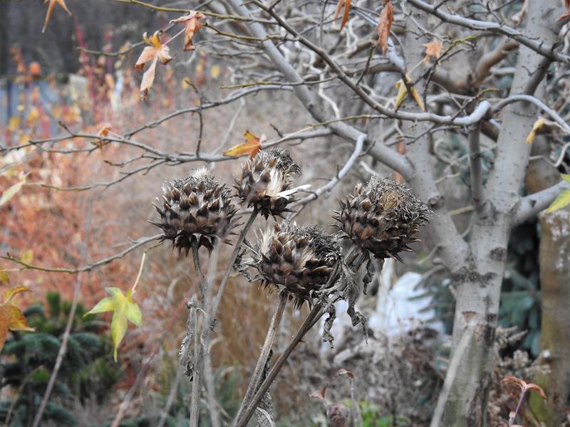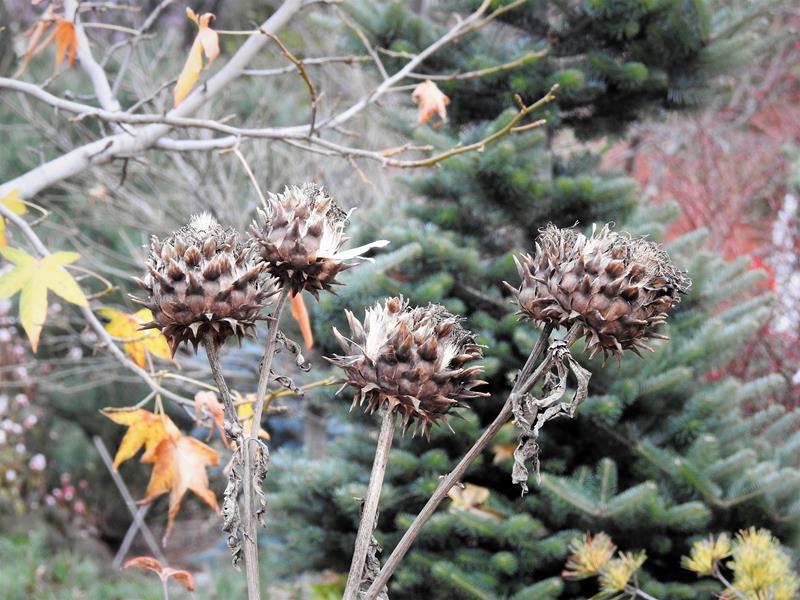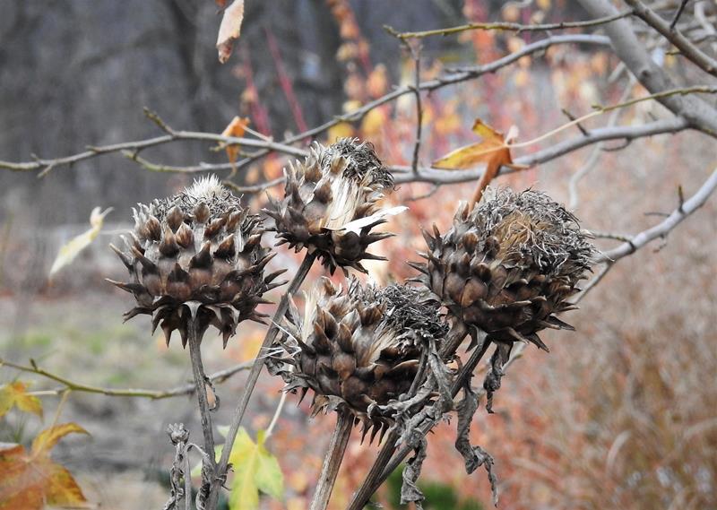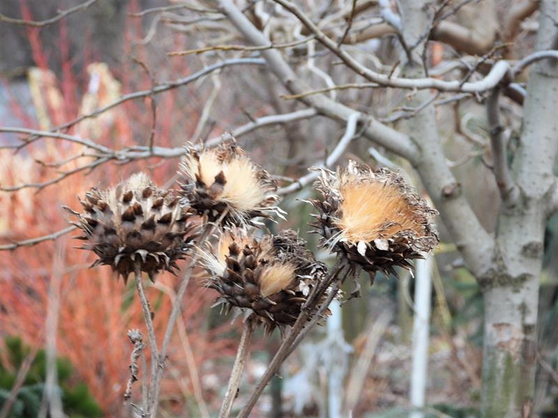 Śnieg, deszcze, gradobicia i porywiste wiatry (sąsiadowi pół dachu zerwało), a karczoch dalej dzielnie trzyma swoje zaschnięte kwiatostany na wysokiej