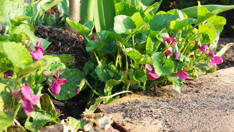 Viola jooi do końca sezonu są nieskazitelne, błyszczące i zebrane w ładne, foremne kępki skupionE przy ziemi. Kwiaty są jasnofioletowe, ale duże w stosunku do całej rośliny i pojawiają sie w sporej ilości w kwietniu i maju a nawet w czerwcu . Dodatkowym ich plusem jest przyjemny zapach, który wyczujemy, gdy zbliżymy się do rośliny na około 30-40 cm. W miejscu kwiatów zawiązują się owocniki, które pękając gwałtownie rozsiewają się , gdy trafią na podatny grunt. Nie jest to tak ekspansywny samosiew, jak na przykład fiołków Frackles