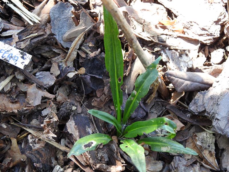 Liście lśniące, lancetowate o pięknej głębokiej zieleni, z jaśniej zaznaczonym nerwem pośrodku, złożone w rozetkę o wysokości najwyżej 10 cm. Kwitnienie zaczyna się w maju, uwaga - źródła podają jako termin czerwiec a nawet lipiec. Nie wiem dlaczego, nie zdarza się, by rośliny na Pomorzu były wyrywne, szczególnie wiosną, która znana jest z tego, że jej raczej nie ma