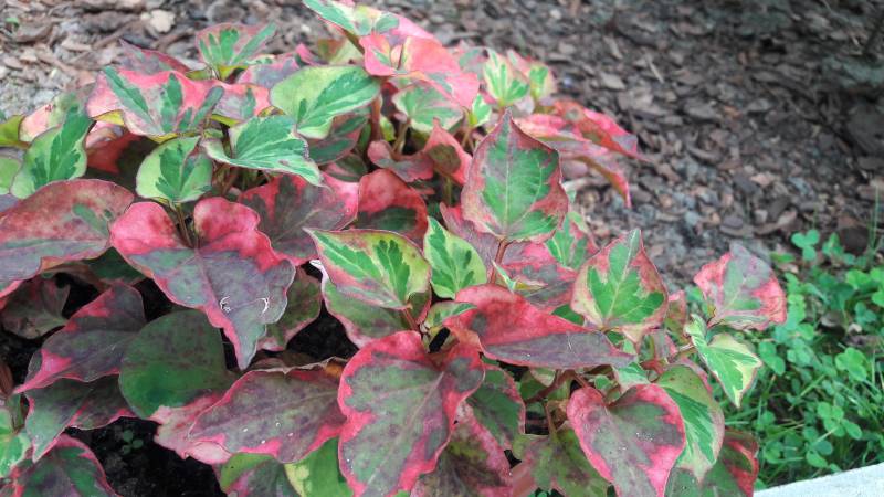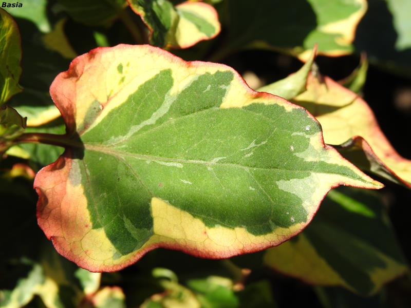 Liść: niezwykle dekoracyjny, sercowaty, w kolorach: różowo-malinowy, krem, zielony.
