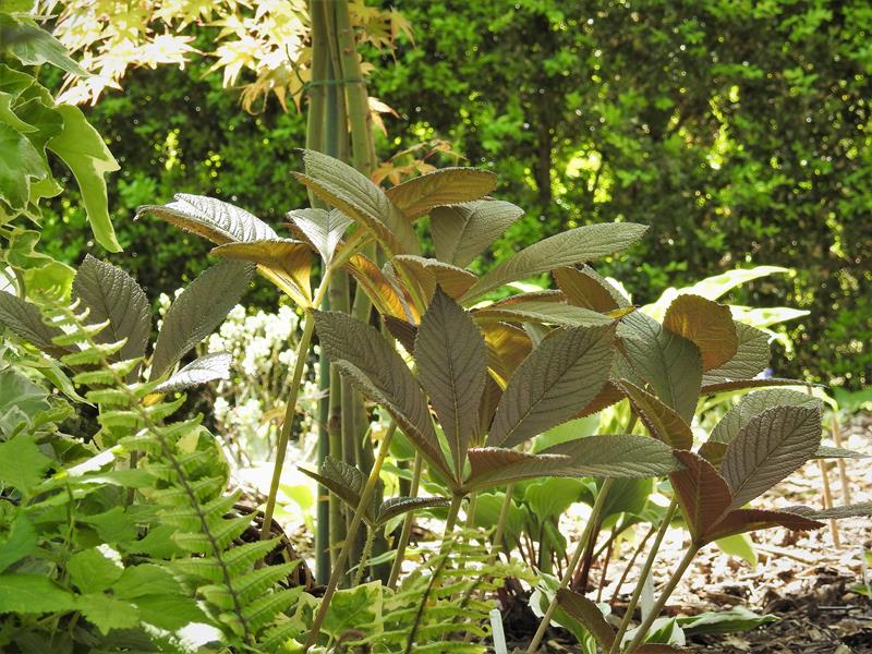 Rodgersia pinnata 'Chocolate Wings' rozwija liście a wraz z nimi pojawiają się pąki kwiatowe