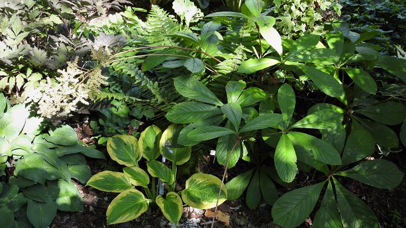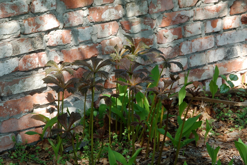Moja niezawodna rodgersja kasztanowcolistna. Cóż, zamiary zamiarami, a rzeczywistość sobie. Miałem przenieść, nie przeniosłem i już raczej nie przeniosę, planowane miejsce zajęte, niech trwa tutaj. Po prawdzie to szkoda mi jej ruszać, wszystkim się tu podoba, więc problem z głowy. Czasem się ją tylko trochę ograniczy, z jakim skutkiem, to już inna sprawa. 2smiech Wystawa północna, trochę słońca rano i wieczorem, resztę dnia cień, ale widny.