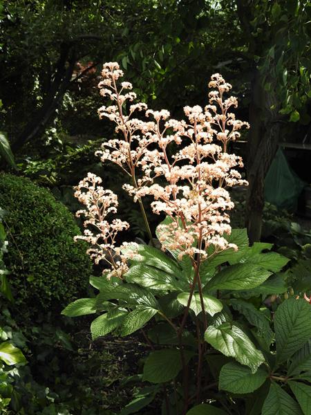 Lipcowa Rodgersia aesculifolia rosnąca w cieniu starej śliwy.