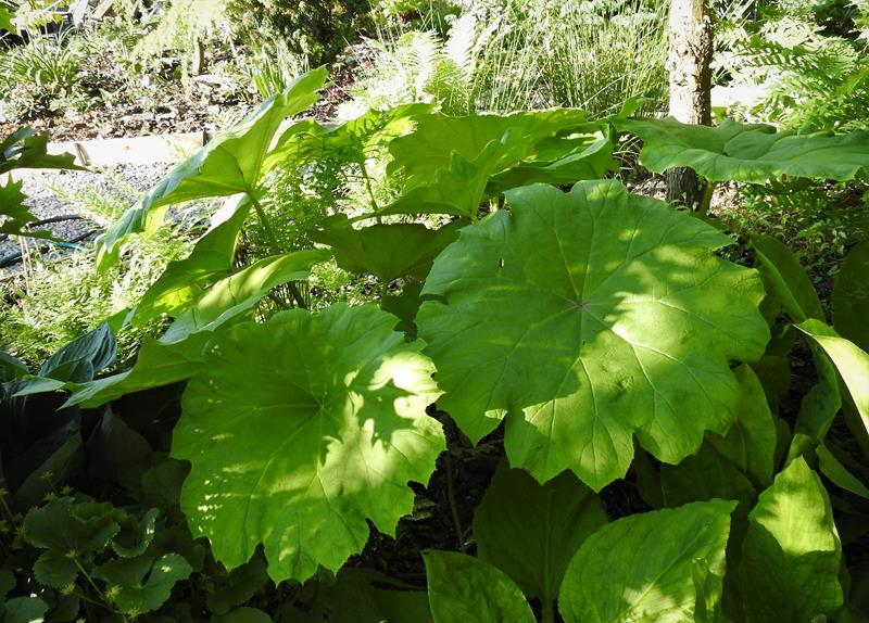 Rodgersja tarczolistna (Rodgersia tabularis) rosnąca na stanowisku półcienistym, pod koronami drzew liściastych.