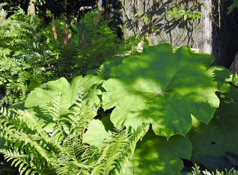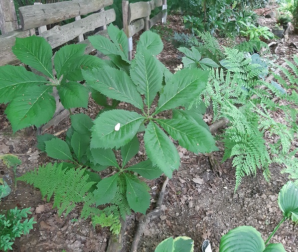 Rodgersje tarczolistne mam dwie. Ta rośnie na stanowisku, gdzie słońce z rzadka dociera.