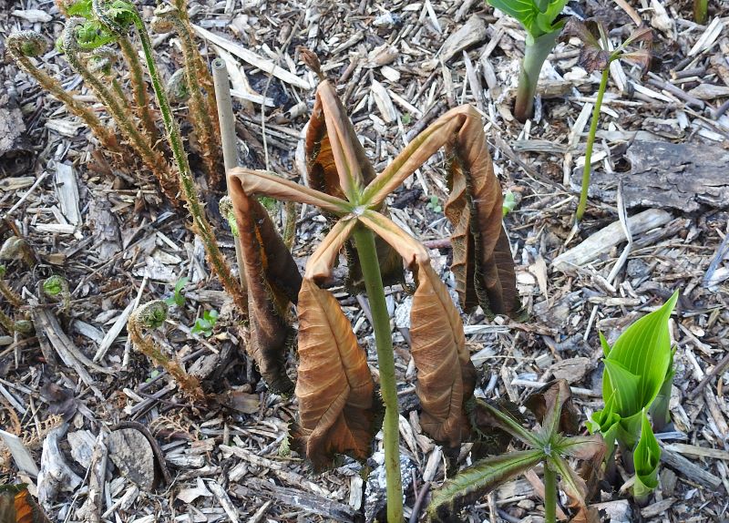 Dziś wygląda jeszcze gorzej, pędy niestety nie podniosły się, czernieją. Rodgersje są bardzo wrażliwe na przymrozki.