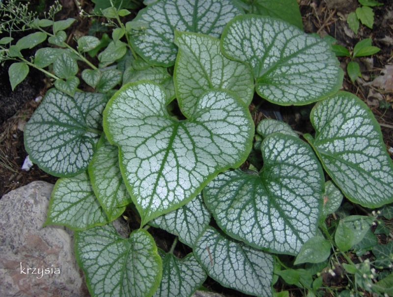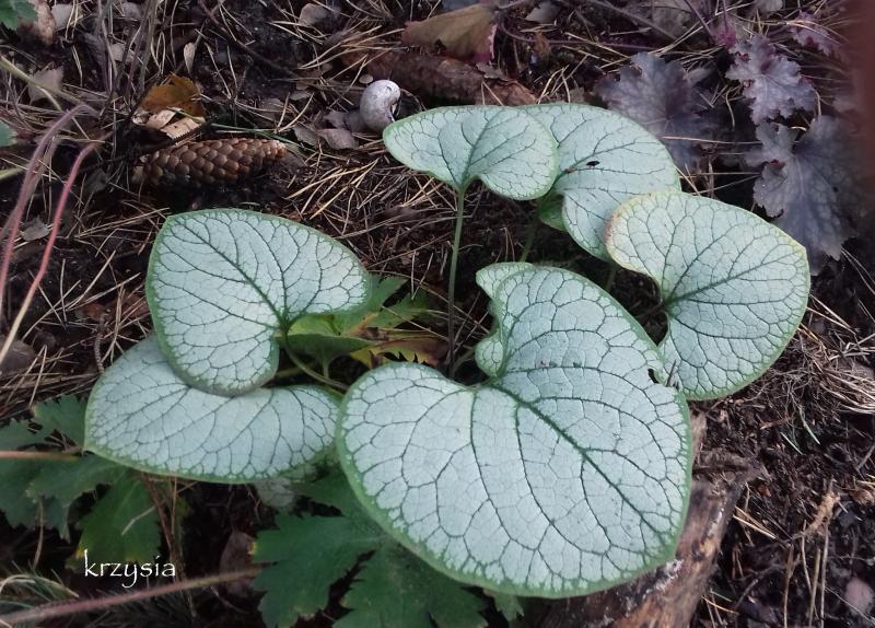 Przypadkiem odkryłam, że mam zdjęcia jeszcze dwóch swoich bruner. Nieduże, w ubiegłym roku oderwane od Leszkowych, variegata to był kawałeczek korzonka z małym listkiem, ale udało się clap . Zakopałam ją lekko ukośnie w ziemi, delikatnie przycisnęłam dużym kawałkiem kory i bardzo dbałam, od wiosny liści przybywało, jednak coś dopadło wszystkie moje brunery. Stosowałam naprzemiennie dwa środki na przędziorka, poza tym przy okazji opryskiwania innych roślin psikałam też Topsinem i Mospilanem. Potem jeszcze kilka razy oprószyłam mączką bazaltową i usuwałam zaatakowane liście. Jesienią stan się wyraźnie poprawił.