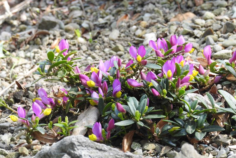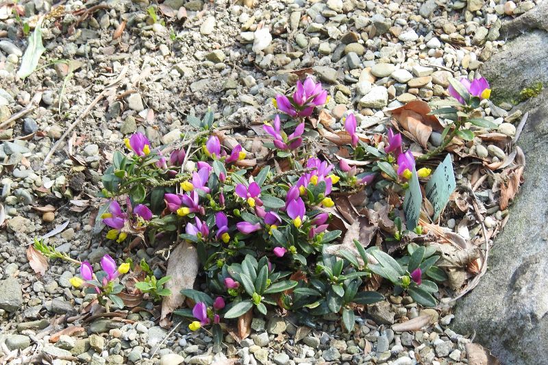 Krzyzownica bukszpanikowata 'Grandiflora' (Polygala chamaebuxus var. grandiflora) jest rośliną zimozieloną. W tym roku nie ucierpiała od przymrozków i wygląda, jakby to było lato