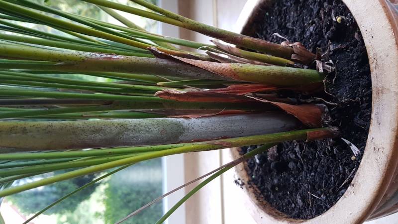 Mam problem z palmą, od jakiegoś czasu liście zaczęły usychać, a na dolnych łodygach pojawiły się czarne plamki i biały/szary nalot. Co to może być? Poniżej są zdjęcia.