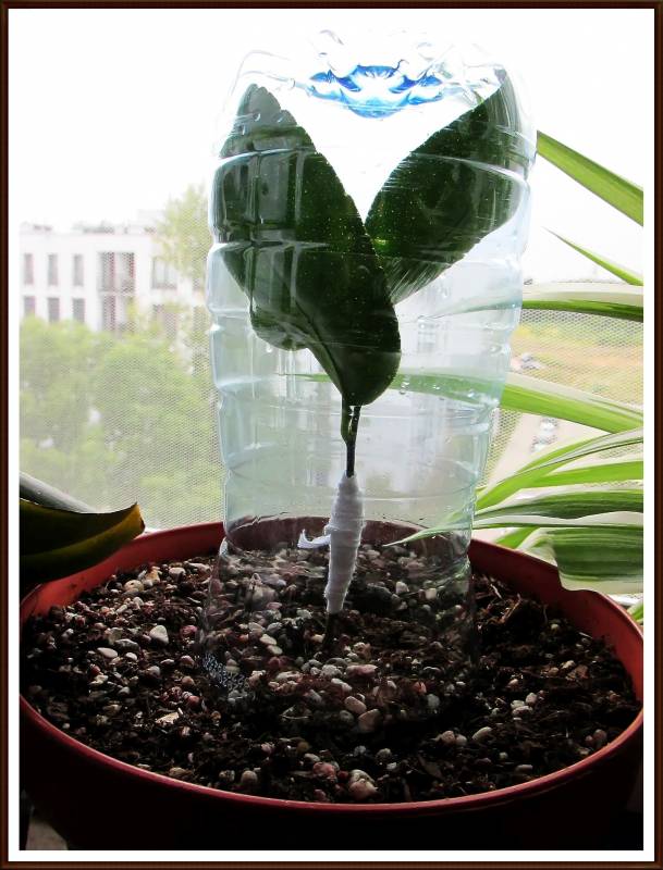 A poniżej wczorajsze szczepienie Cytryny Meyera na pestkowcu Grapefruita. Ciężko poszło, ze względu na naprawdę cienką łodyżkę podkładki. Mam jednak nadzieję, że się uda, to w tym momencie zyskałbym jedno wolne miejsce, a i może "Meyerka" w końcu ruszyłaby ze wzrostem tak, jak powinna:). Niebawem jesień i już muszę kombinować, by wszystkie rośliny pomieścić w mieszkaniu.