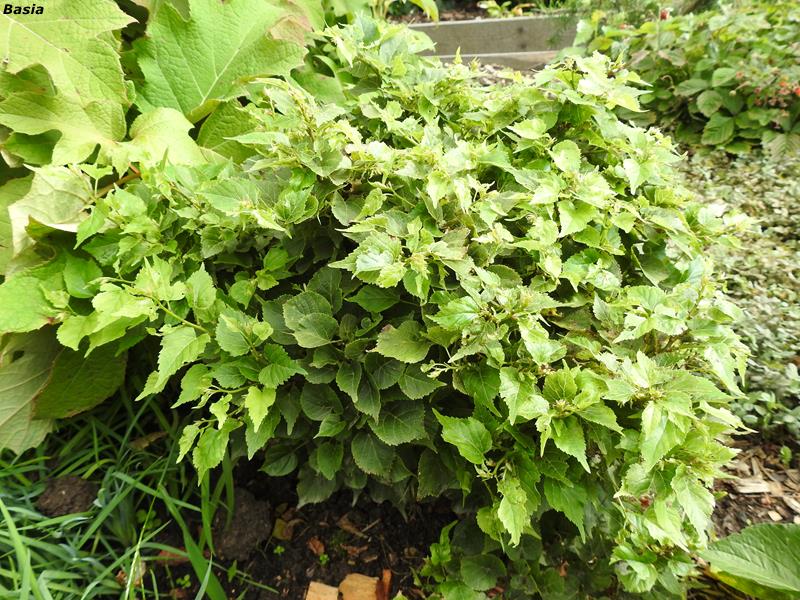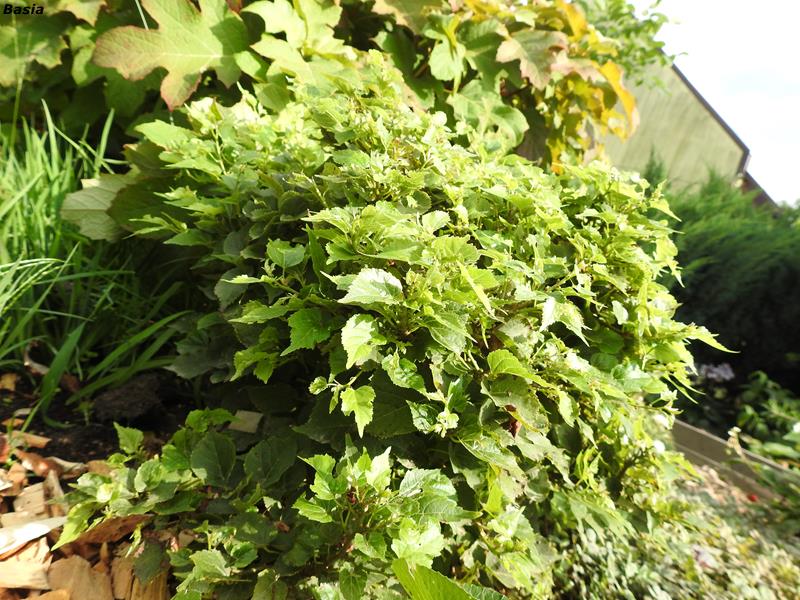Liście: duże do 12 cm. długości, z wyraźnym ząbkowaniem, wiosną brązowawe, starsze zielone.