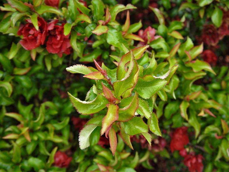 'Red Joy' powoli kończy kwitnienie, ale pałeczkę atrakcyjności przejmują wiosenne przyrosty :)