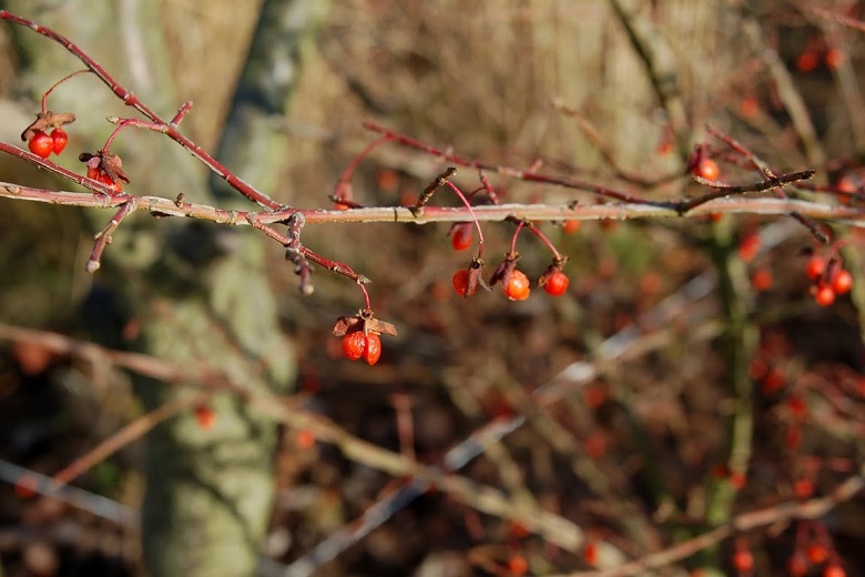 Trzmielina oskrzydlona - po pięknie wybarwionych liściach już nie ma śladu. Opadły wraz z pojawieniem się pierwszych przymrozków. teraz pozostały tylko dobrze widoczne, jaskrawe owoce.