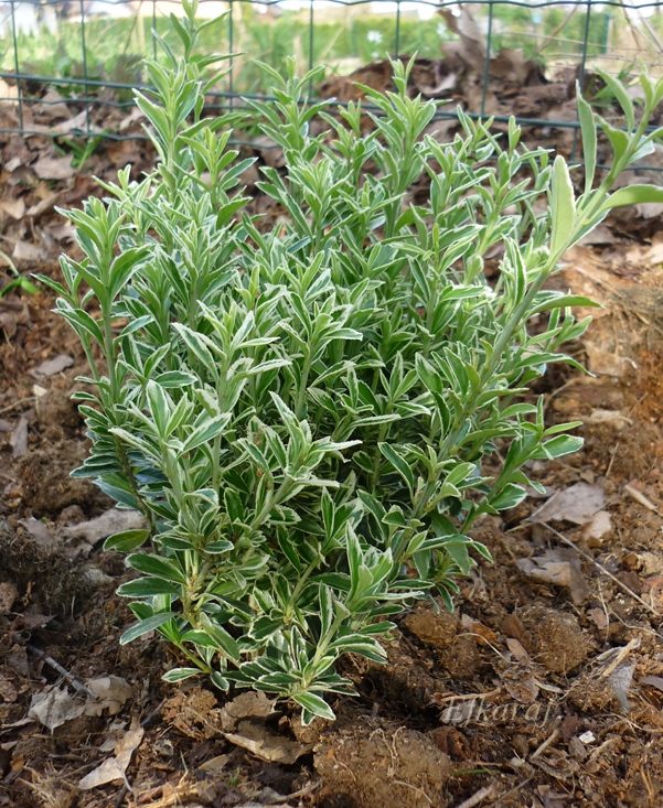Piękna odmiana trzmieliny o pstrych liściach i bardzo jasnych , całkowicie białych , nowych przyrostach.