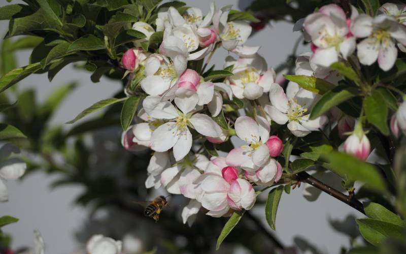 Jabłoń Evereste, korona piramidalna, kwiaty białe.